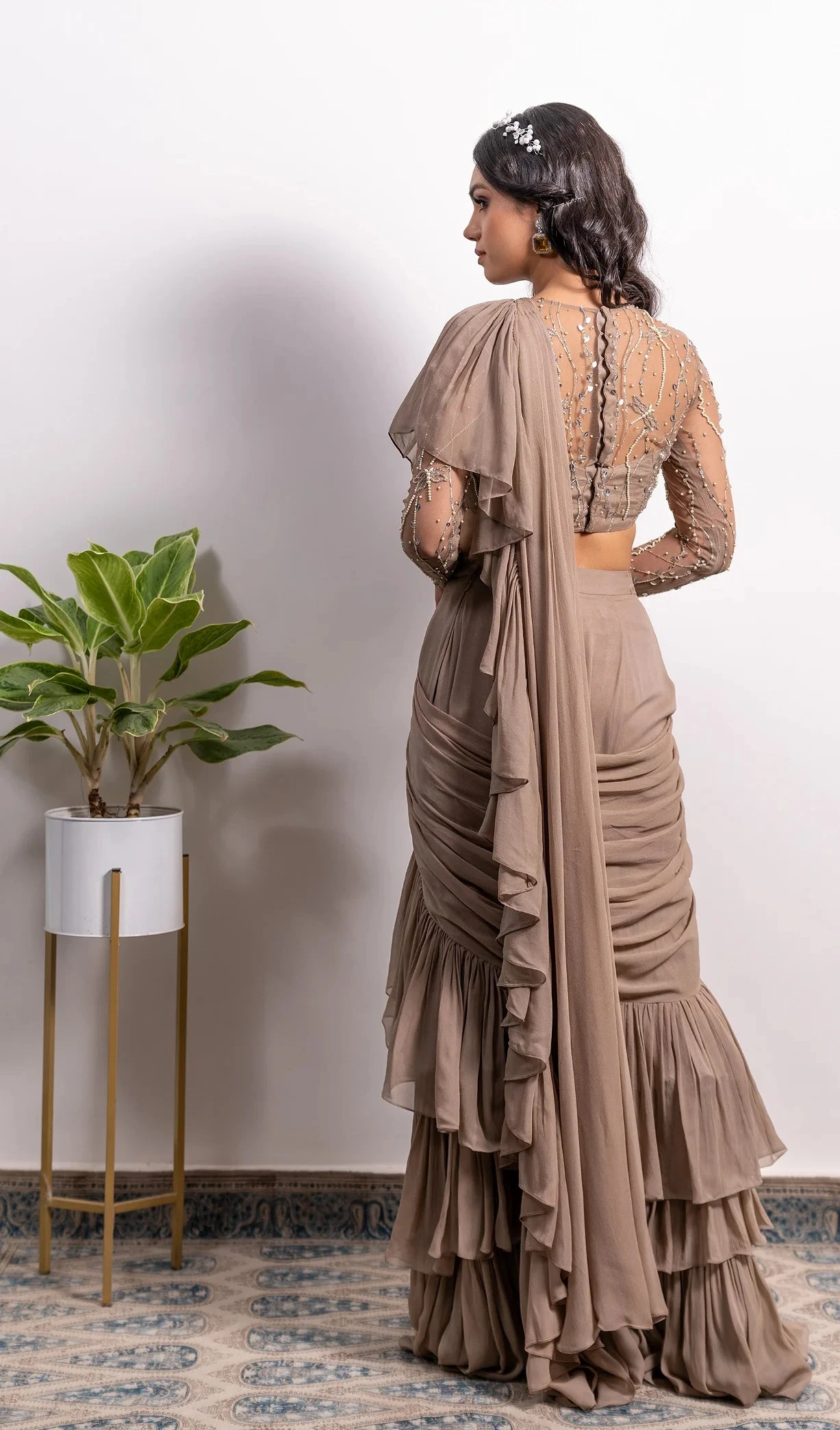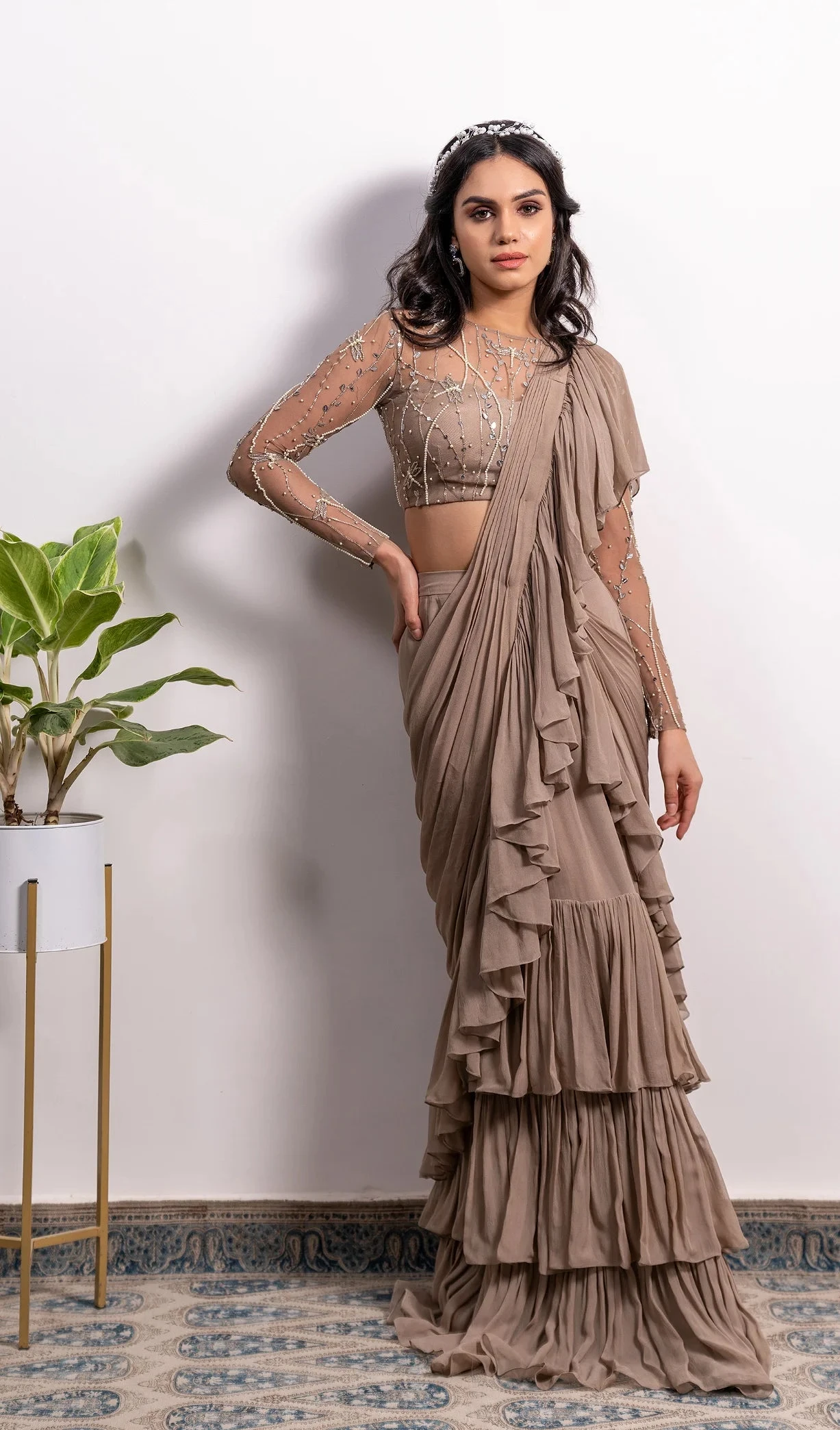 Mouse brown pre-draped saree with ruffle border. Comes with embroidered full sleeves blouse.