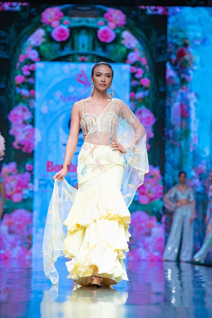 Saree : Crepe & Net , Blouse : Net , Blouse Embroidery : Sequin Work & Salliwork, Saree Embroidery : Gold Threadwork &Cutdana Work
