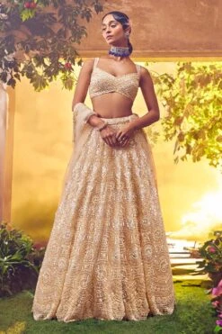 Featuring a dull ivory tulle lehenga embroidered fully by hand with various tonal ornamental sequences and tonal Japanese bugle beads. It is paired with a cutwork dupatta and a stylised blouse .