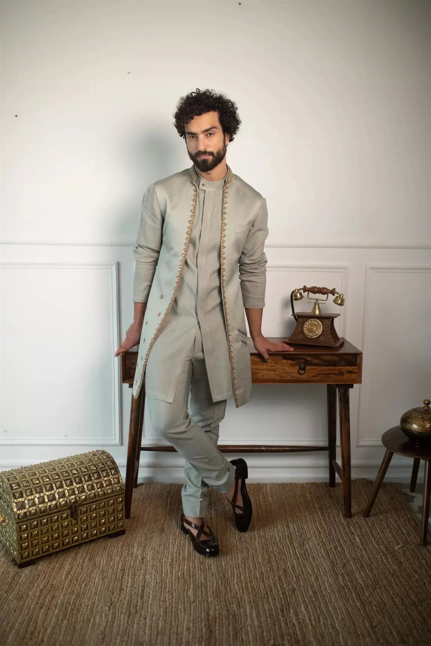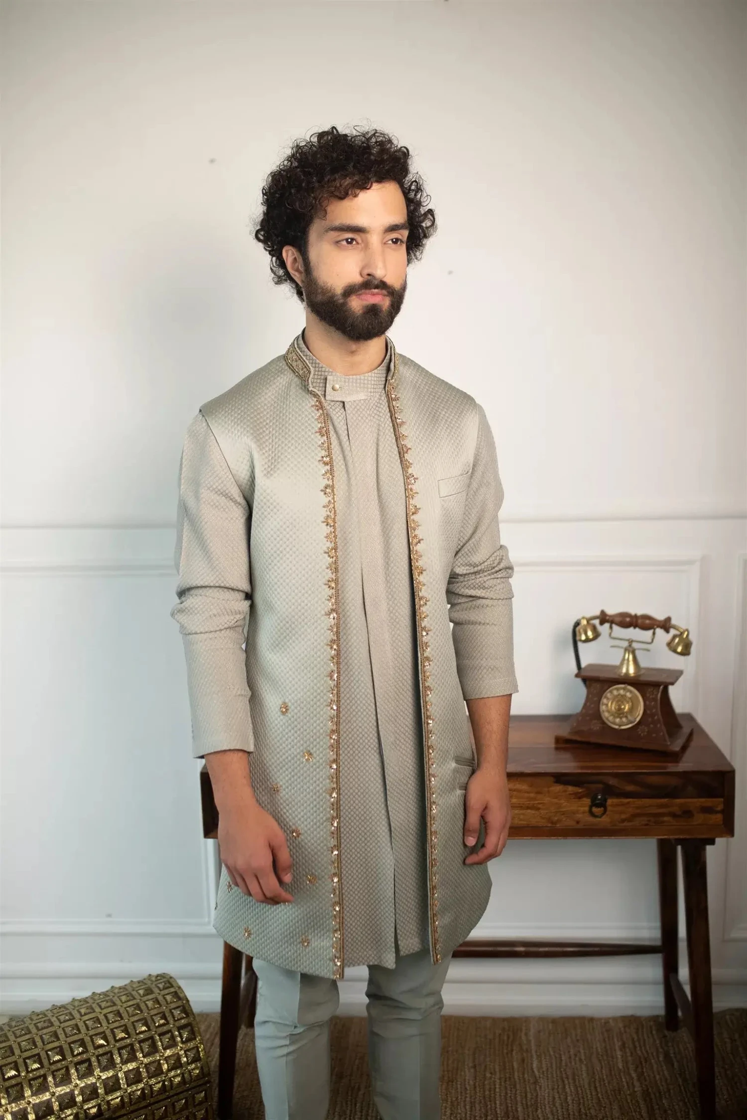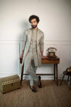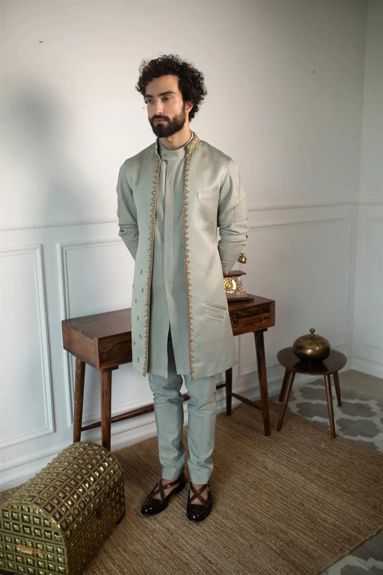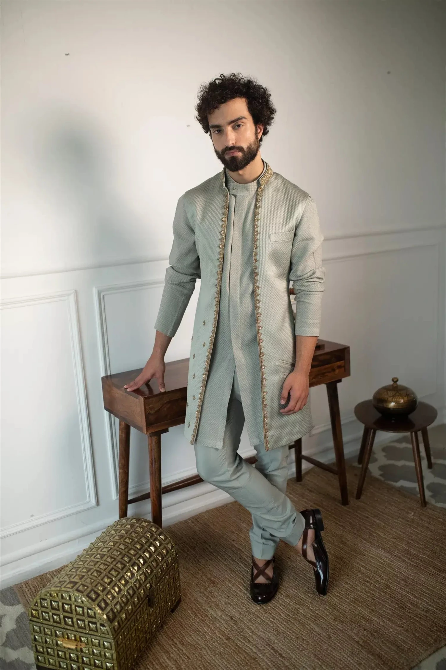 Olive green hand embroidered shrug set with minute geometric detailing on placket,comes with tonal kurta and pant set