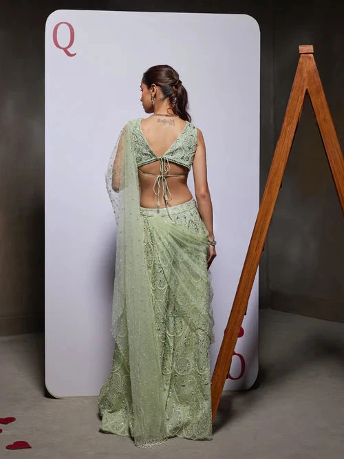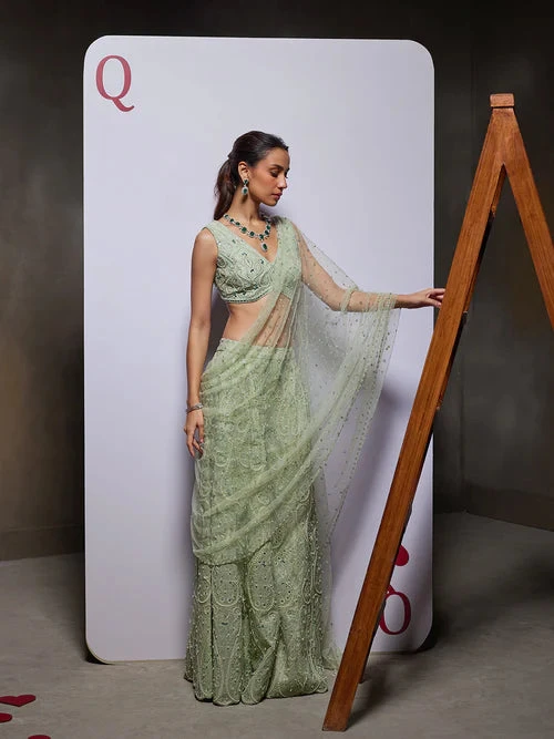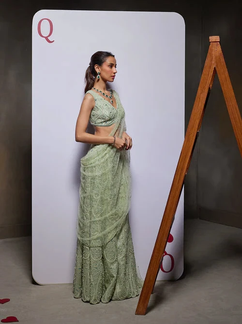 Infusing a dash of modernity and sophistication, our ELIORA Sharara Saree Set exemplifies the brand’s signature craftsmanship. The set includes a concept sharara saree and a blouse adorned with elegant pearl ornamentations.