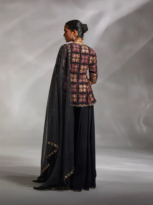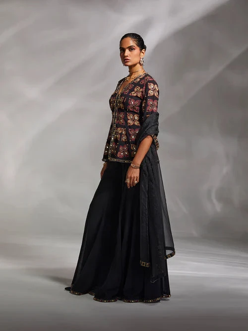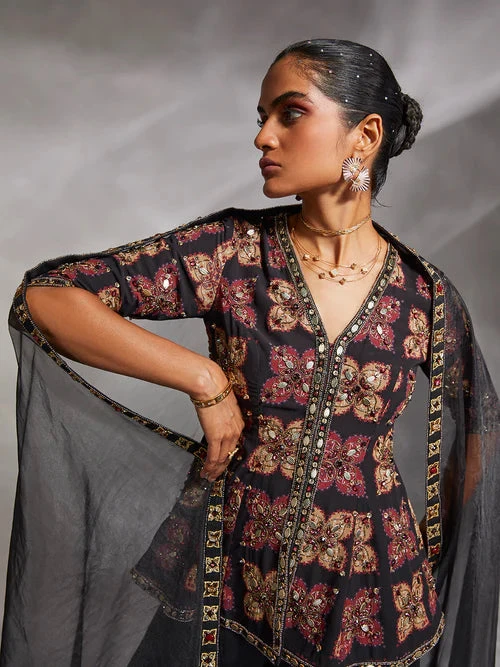 Our Etana set is a masterpiece in boho accents with prints and quirky embellishments. The printed kurti with hand embroidery, solid sharara pants, and classic dupatta with embellished hems elevate the glam quotient.