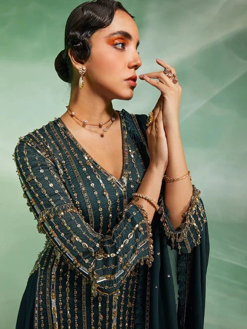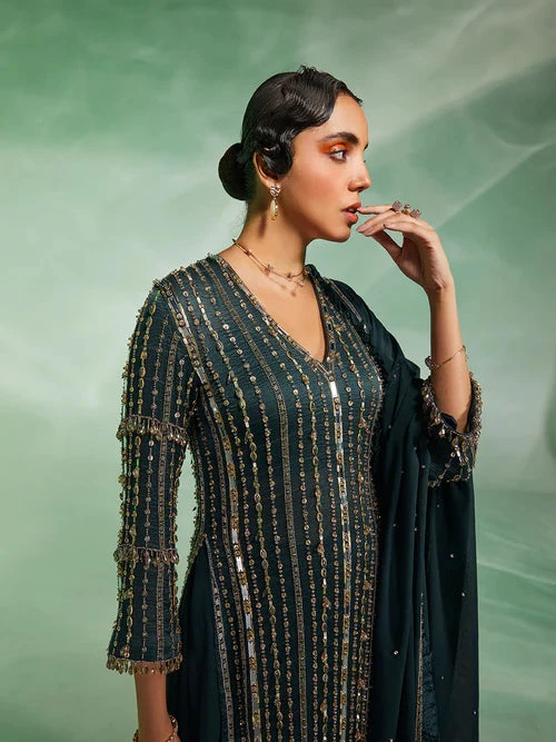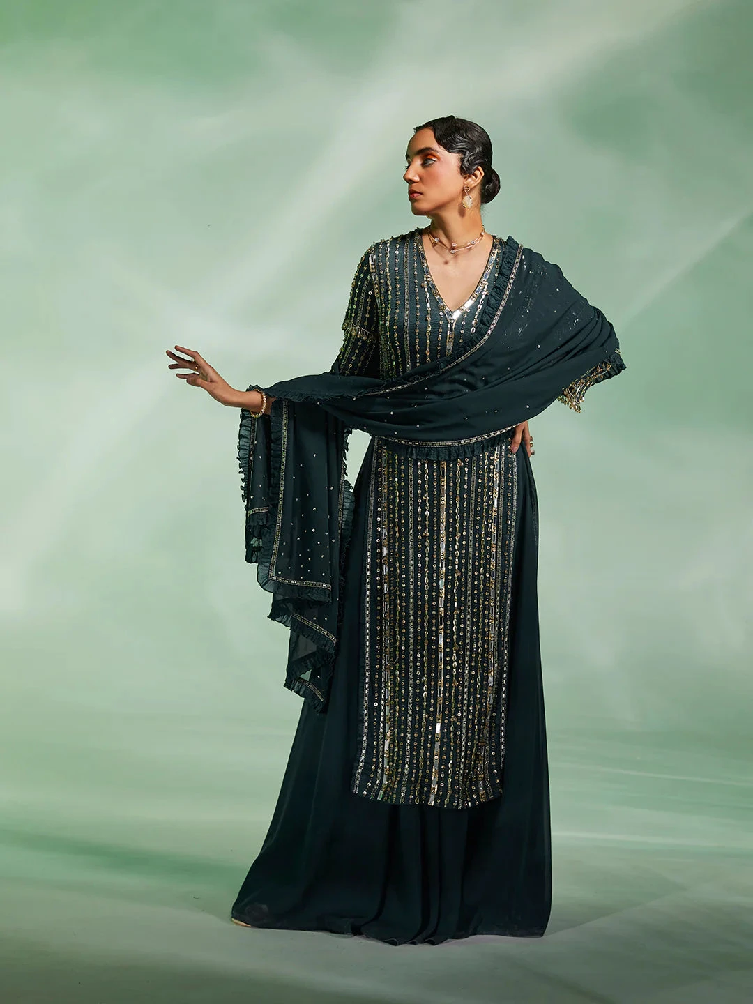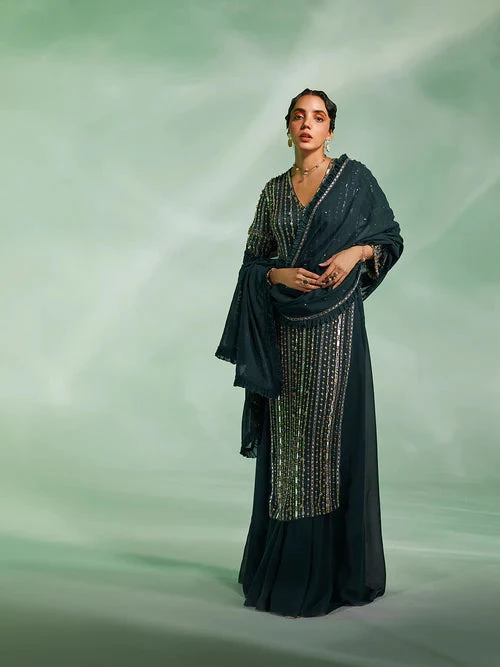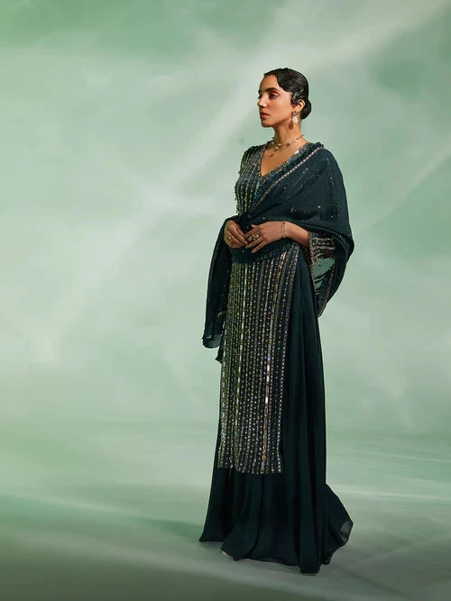 A blend of soothing prints and airy silhouette brings the Eternity set to life. Perfect for every occasion, this set offers an unmissable medley of hand-embellished kurta with high slits, wide-leg palazzo, basic bustier, and dupatta with hand-embroidery on the hems