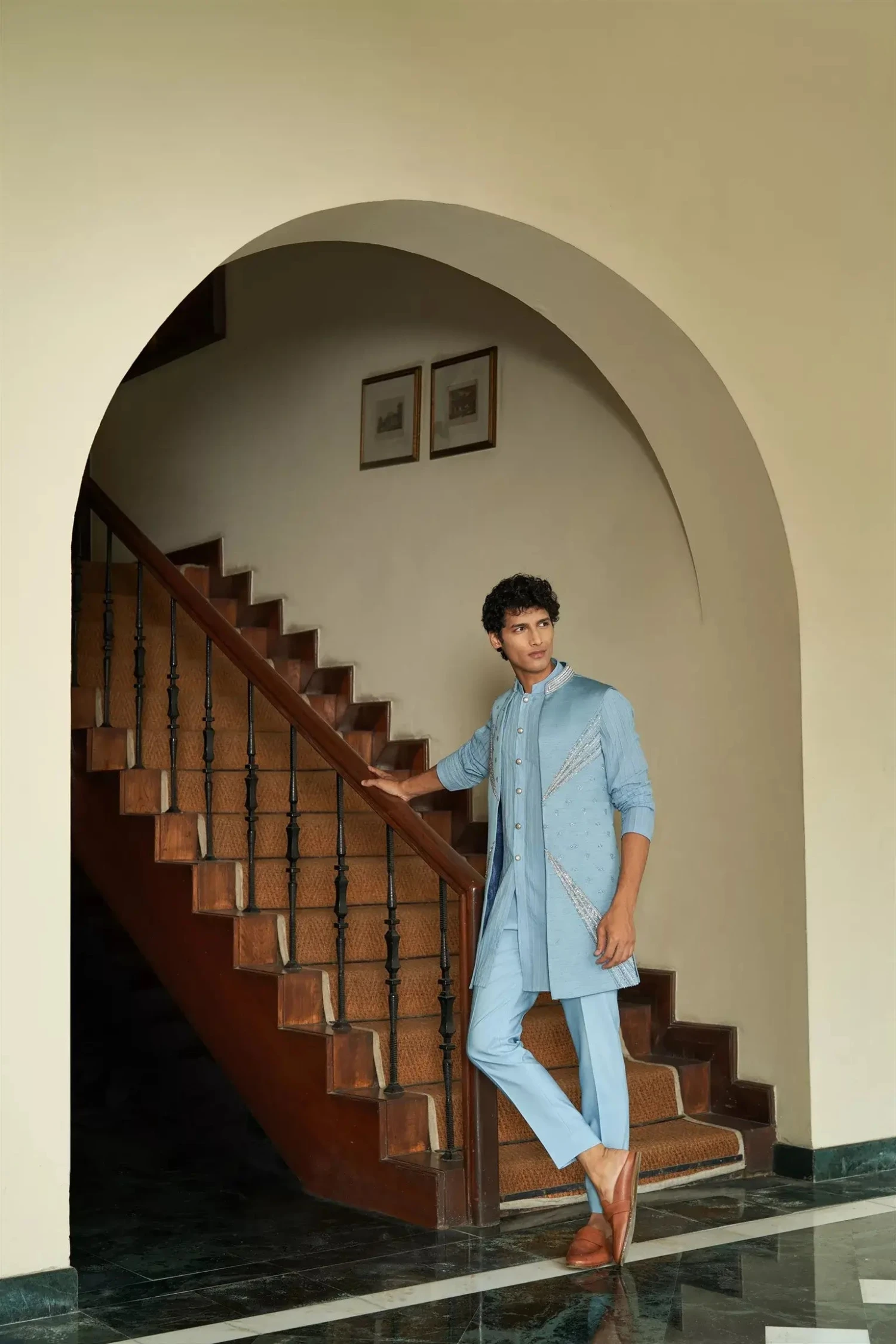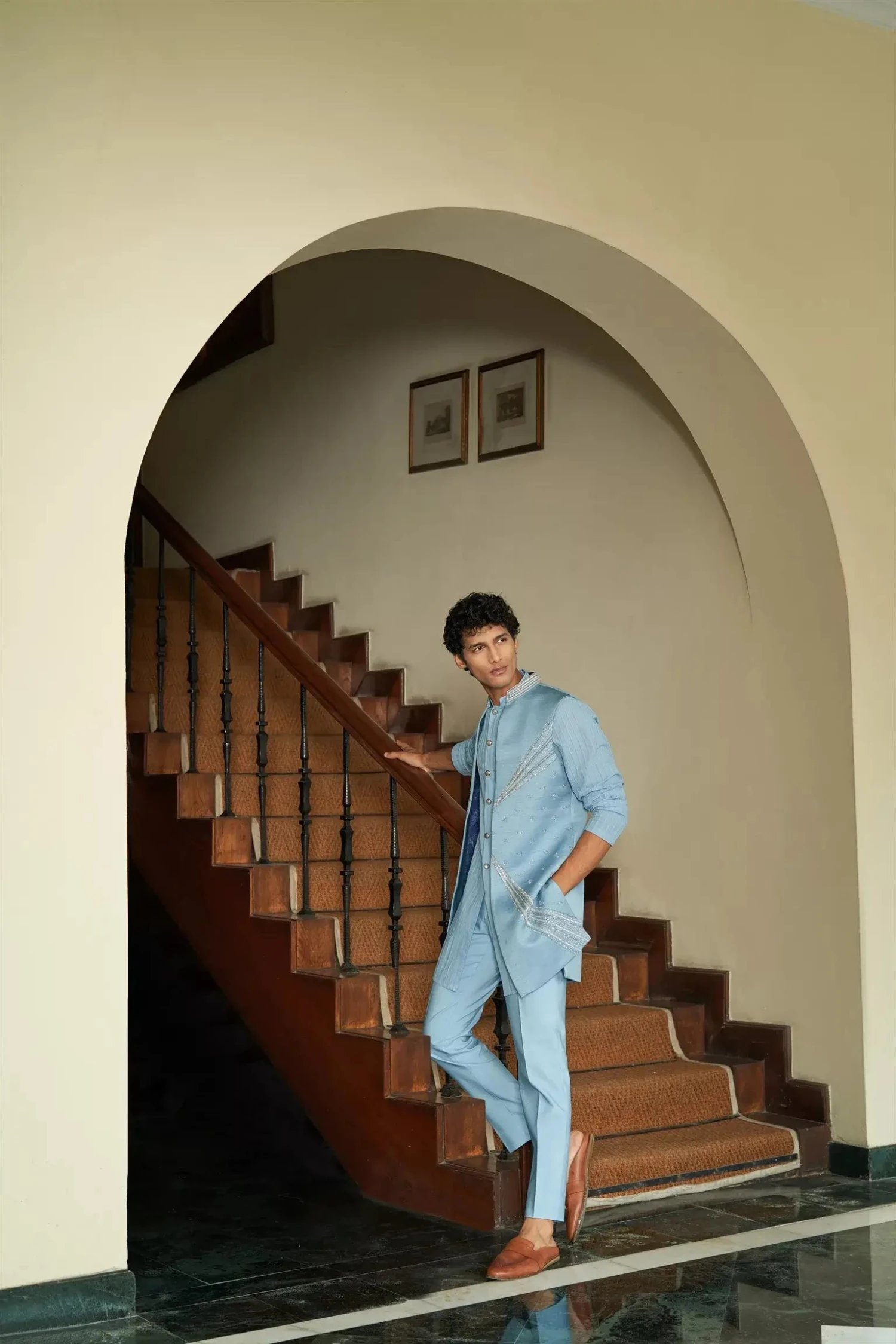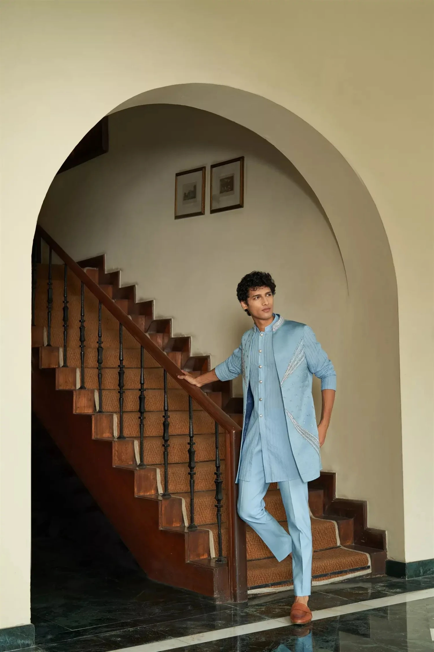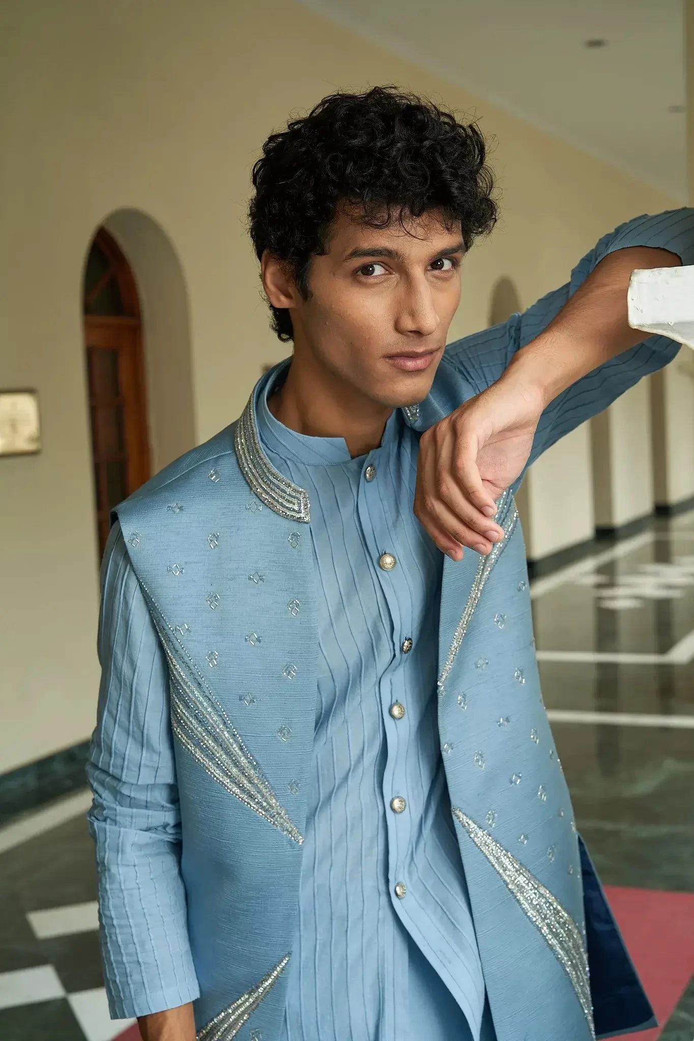 A shrug set that is understated yet glamorous,having very fine contrasting embellishments in a right balance.