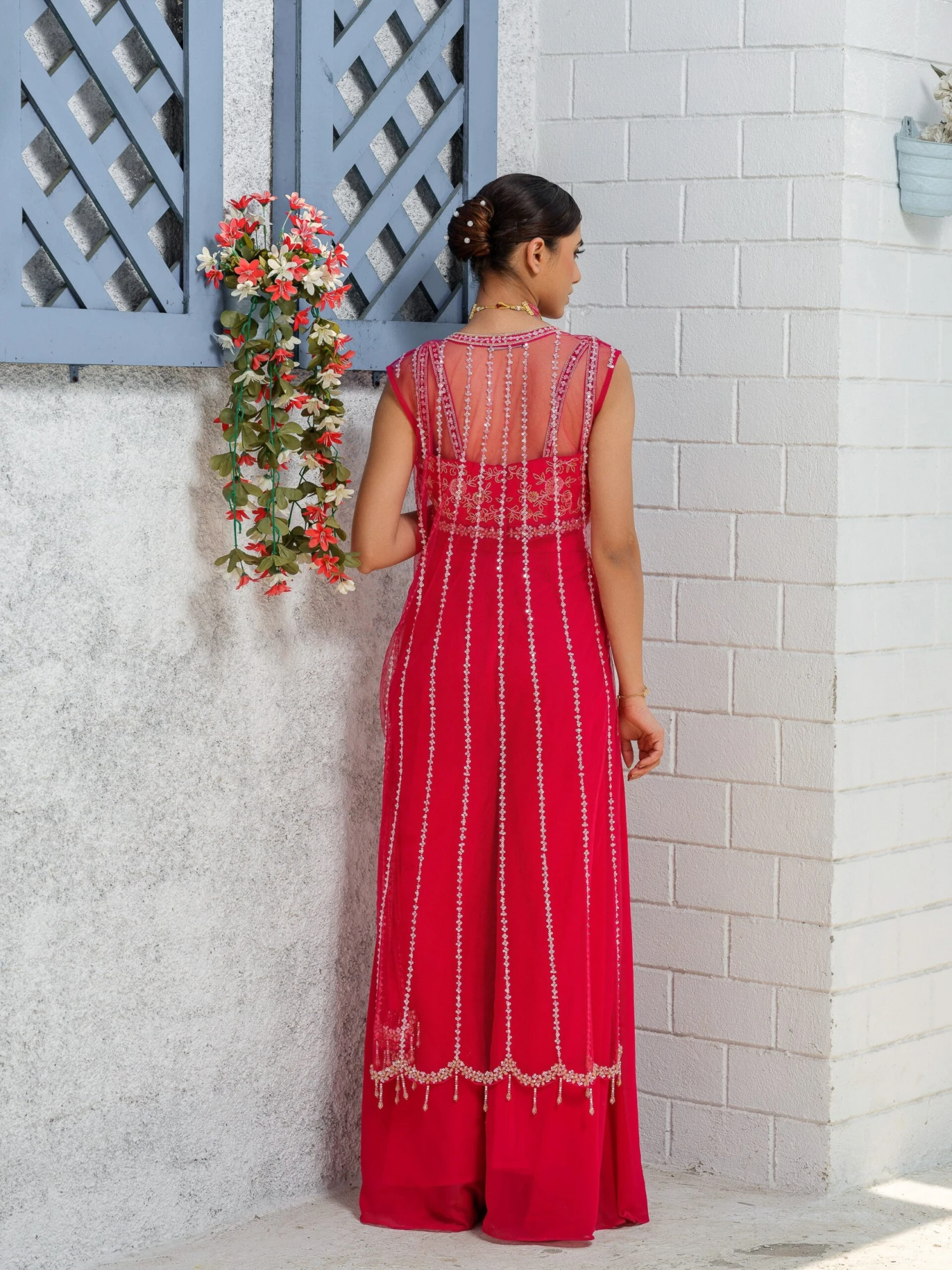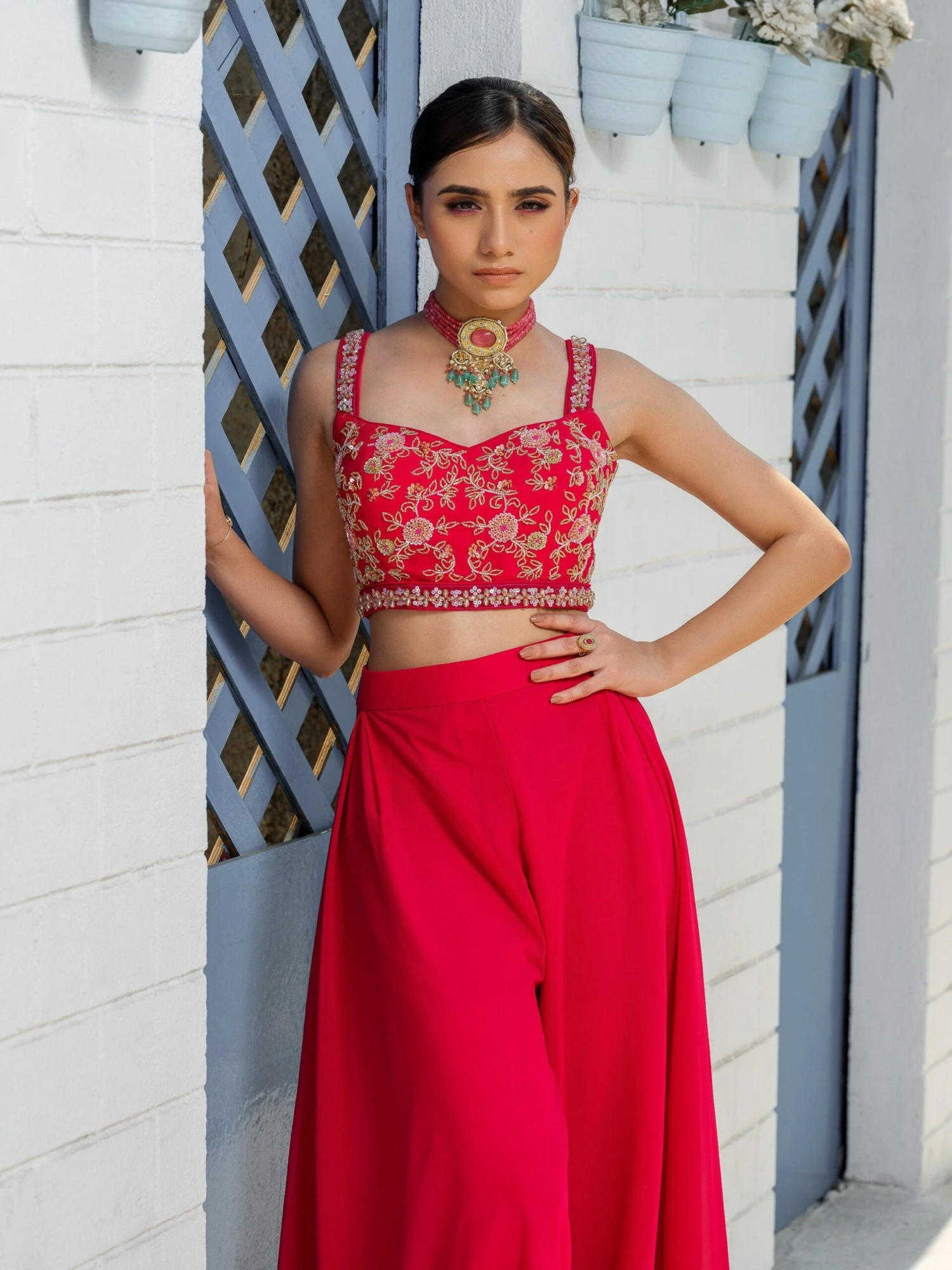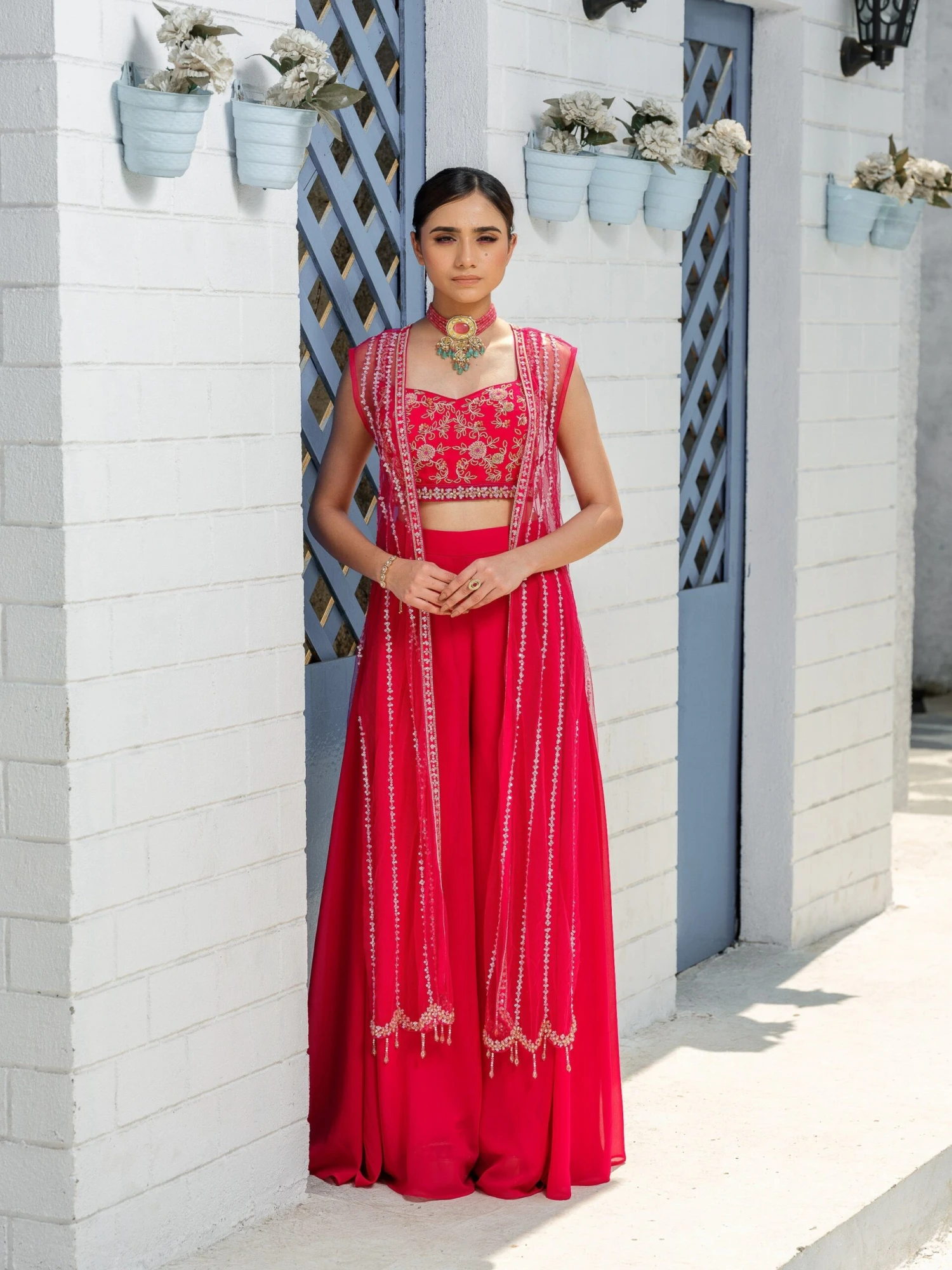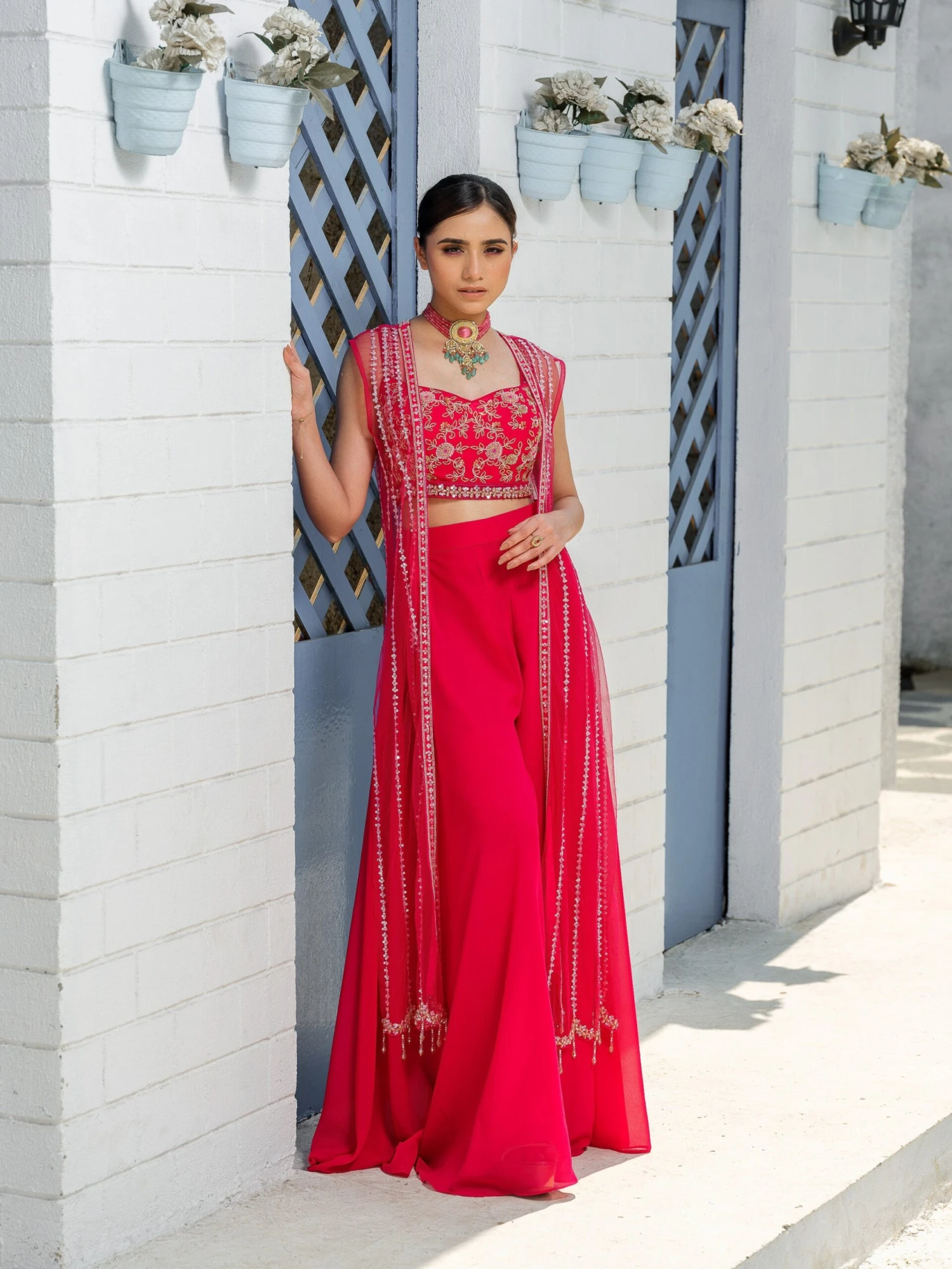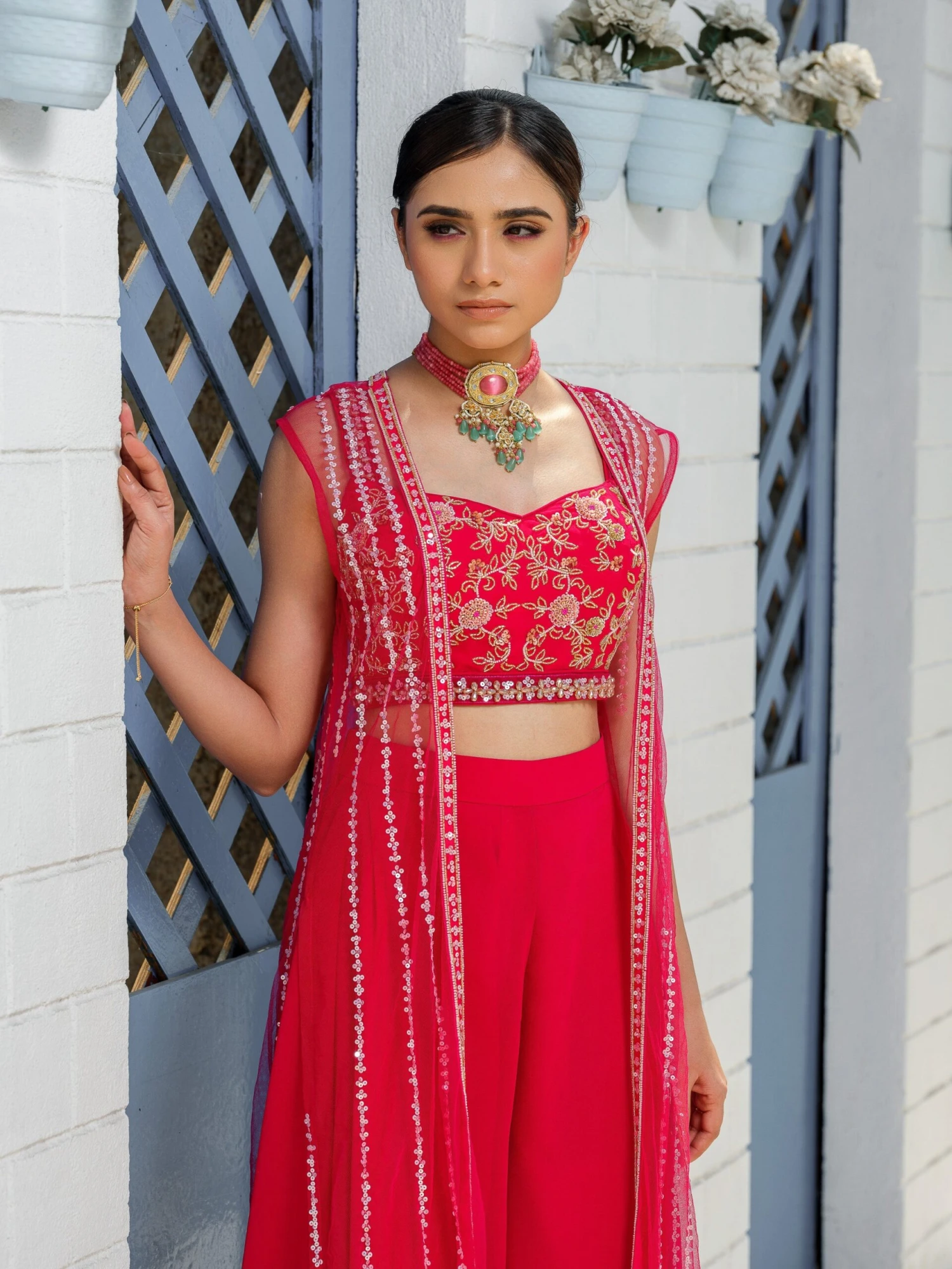 Pink handcrafted tulle jacket paired with box pleats pants and corset style blouse