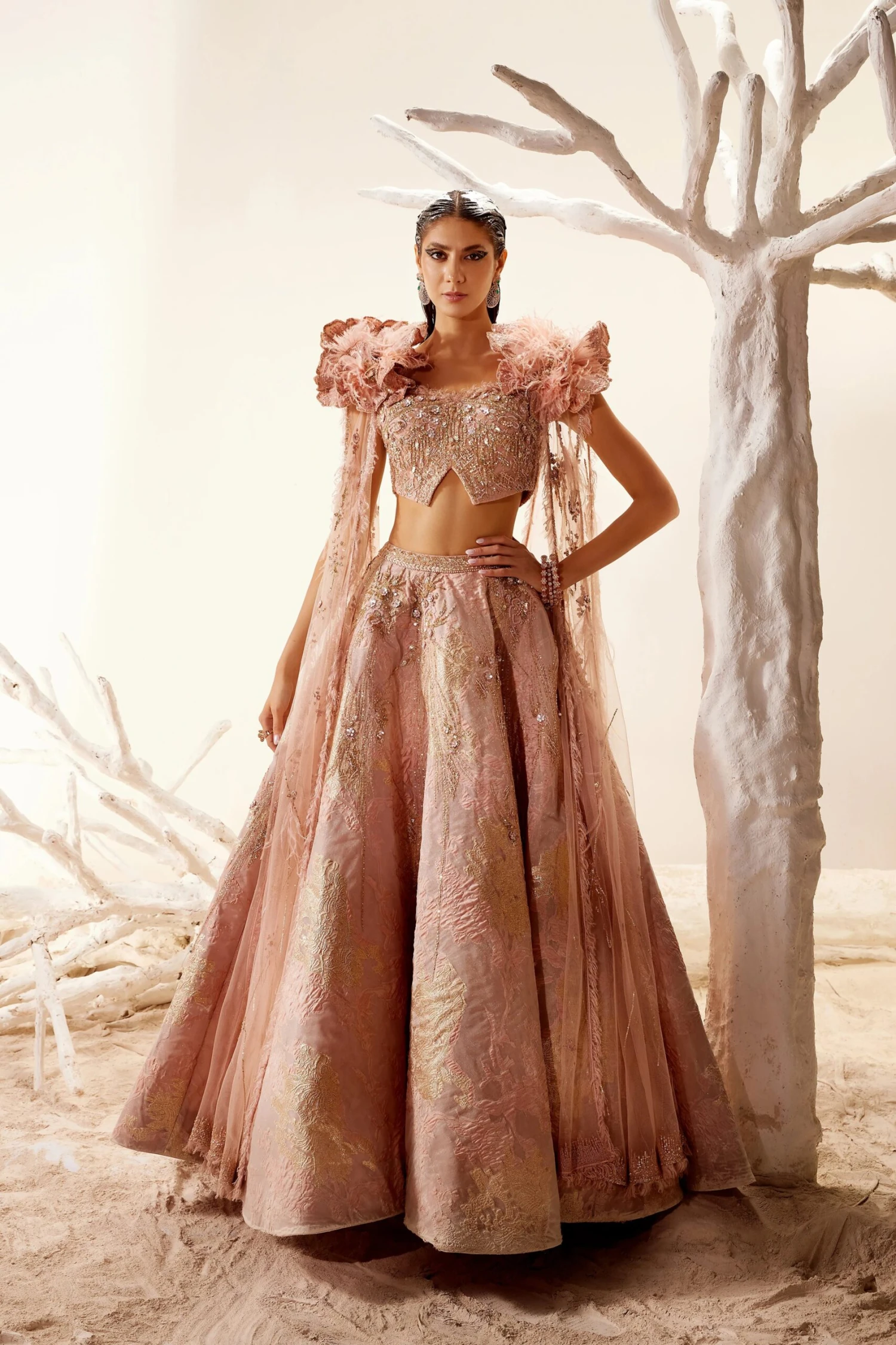 Soft pink blouse with hand embroidery & enlarged lush petal details on the shoulder. Paired with a structured skirt.