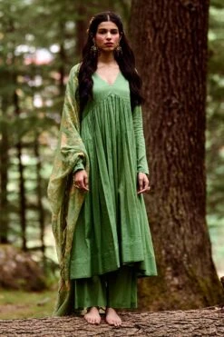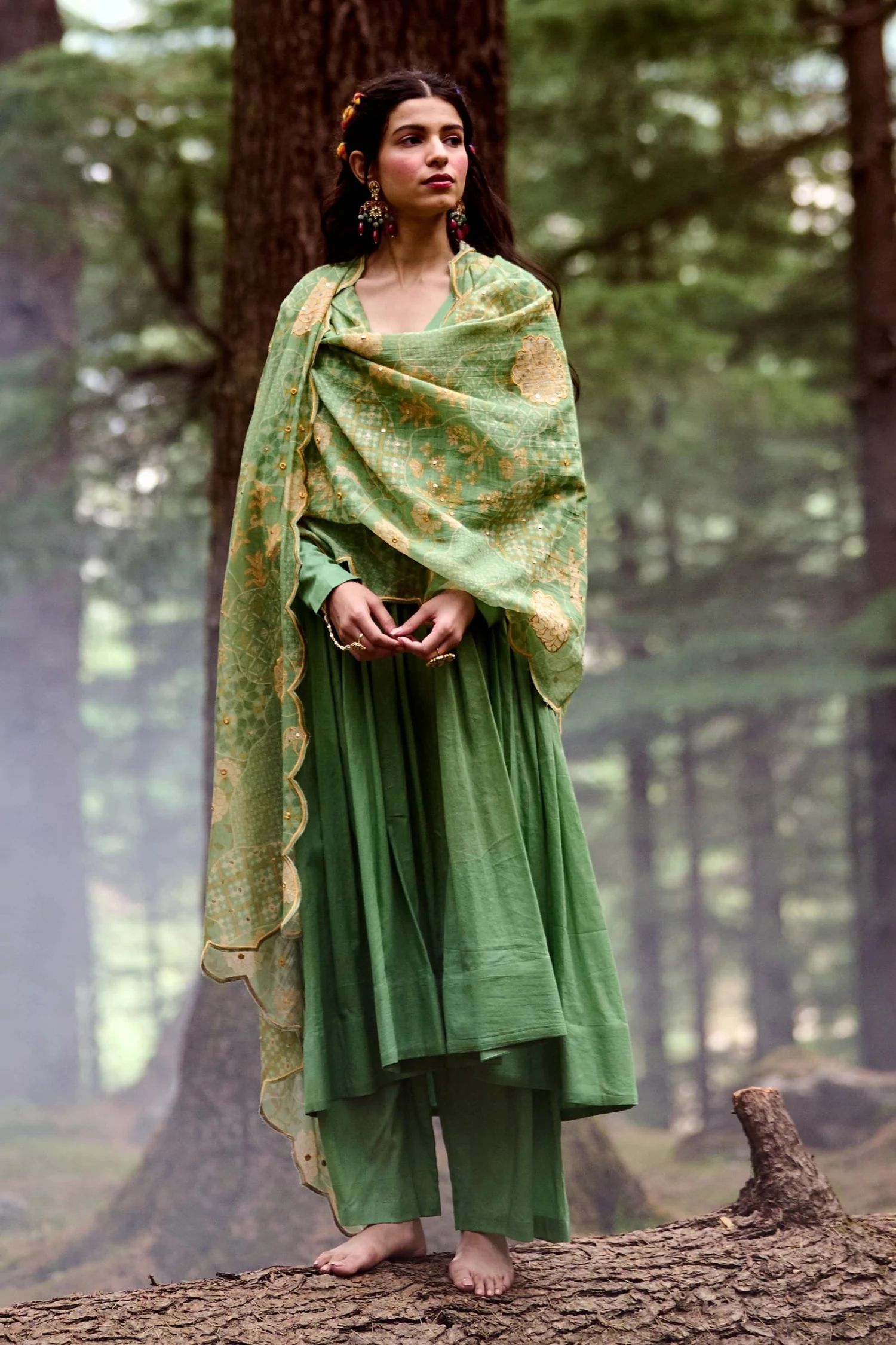 A green v–cut anarkali paired with a naksha print scallop dupatta embellished with sequins and mirror work.