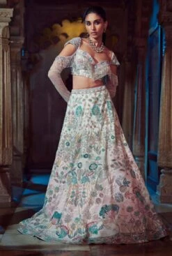 Seen here is setting the dualtone flamingo cocktail lehenga with bold scenery motifs crafted through hand embroidery. The skirt is paired with a heart-shaped blouse with beads & sequins.