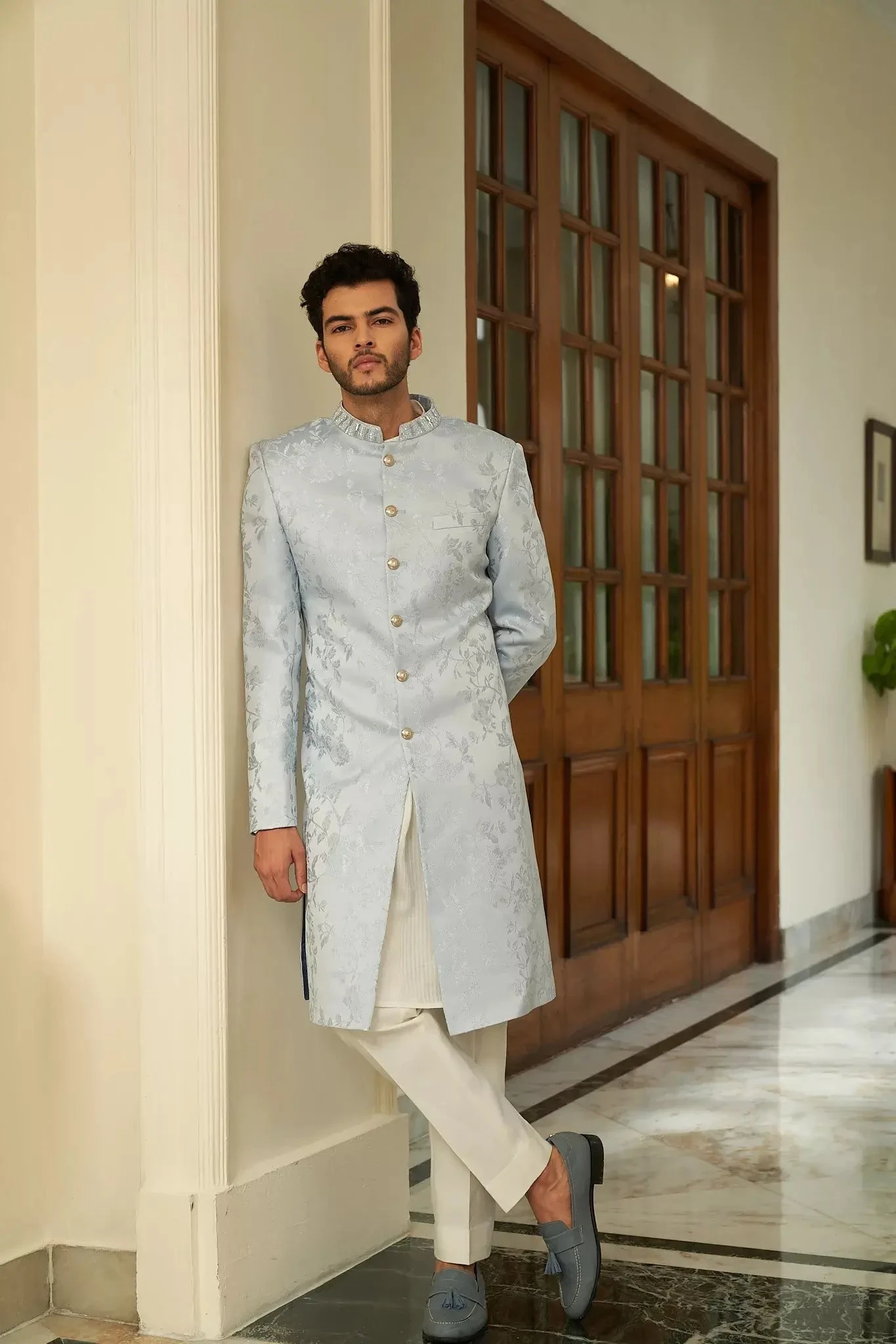 Dreamy floral textures that make a statement.this achkan set is made to ease and perfection