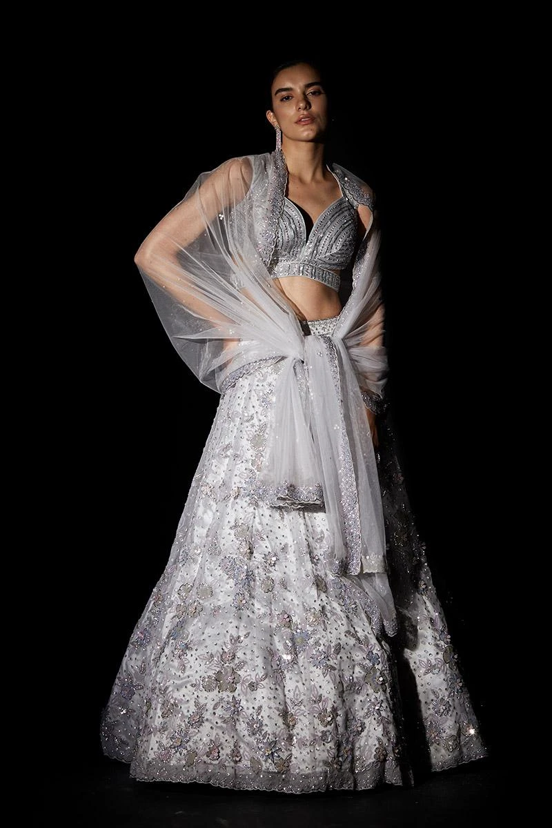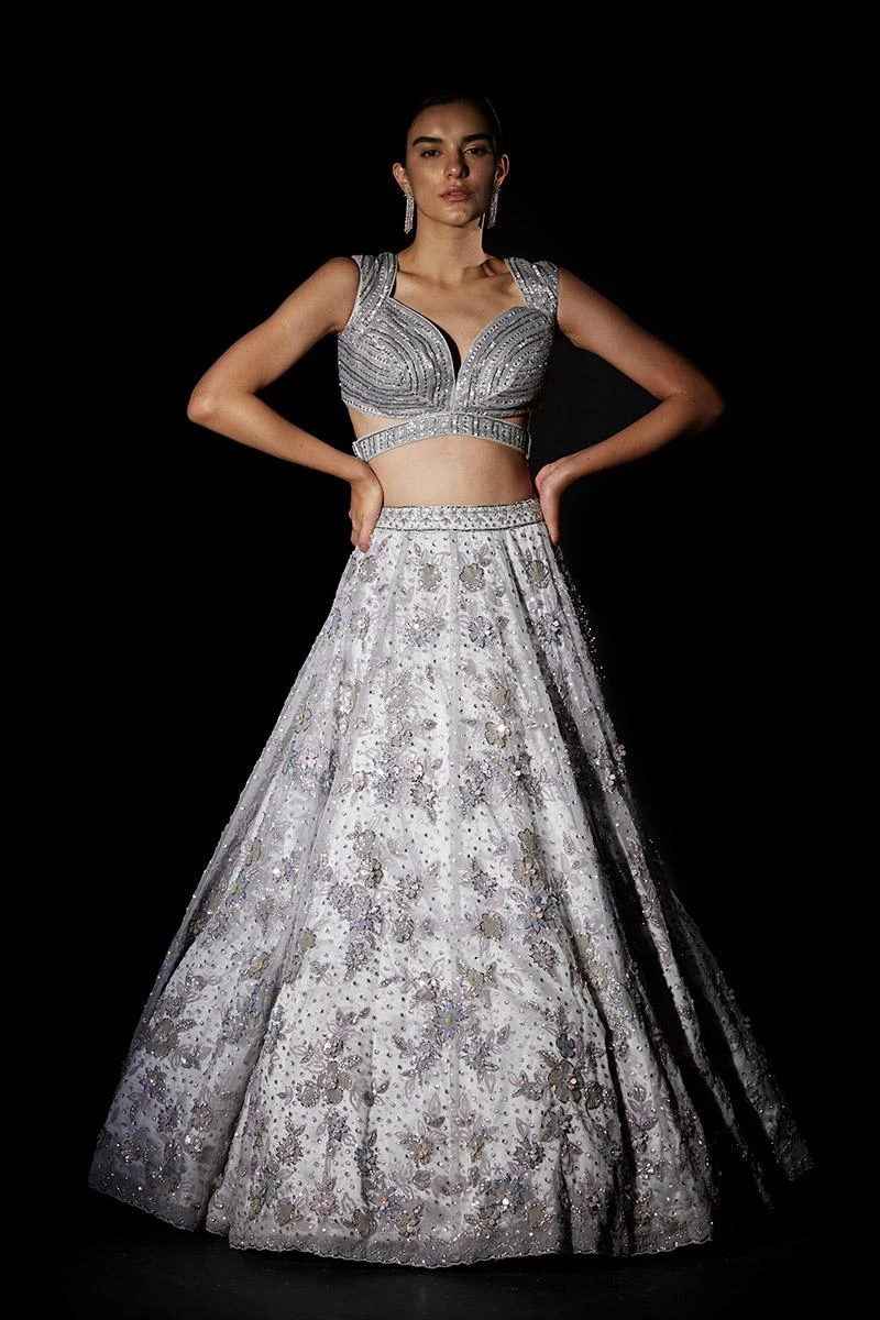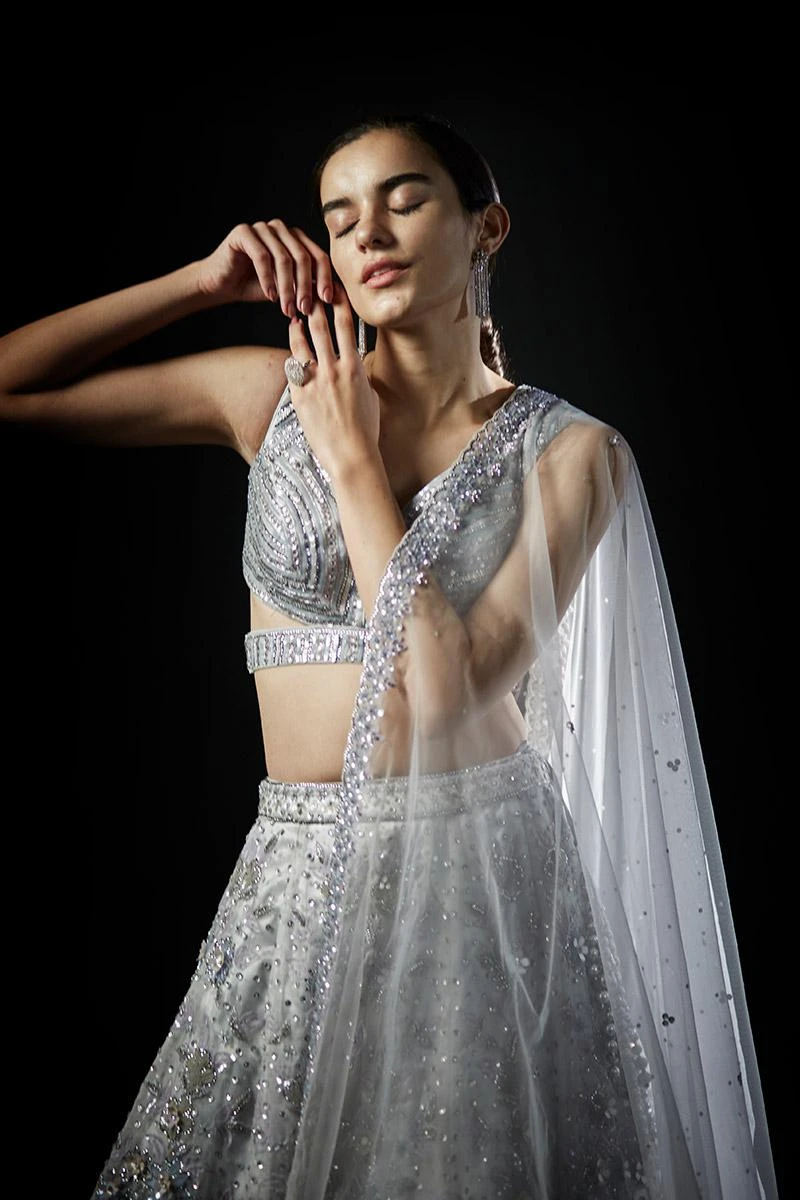 Grey organza lehenga with attached cancan, embroidered with contrasting sequins, crystals and bugle beads. Paired with a sleeveless embroidered, padded blouse & sheer dupatta.