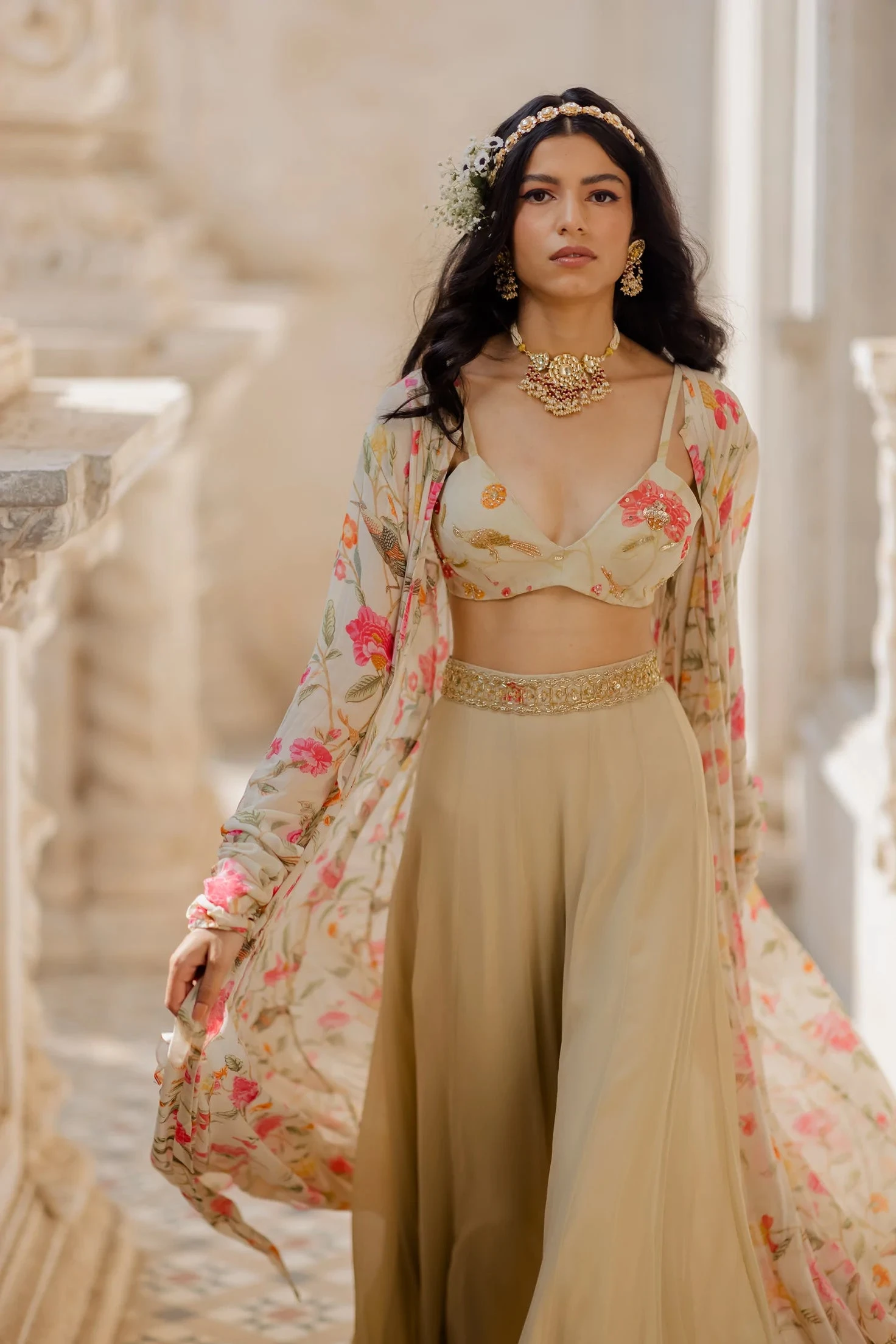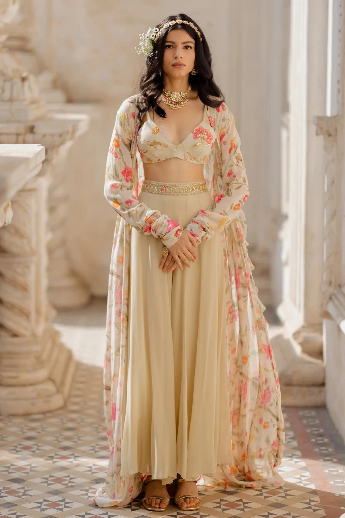 One of our favourites, a three-piece set consisting of a deep neck floral blouse, hand highlighted with cutdana, moti and sequence. Paired with off–white georgette palazzos, and a hand–embroidered belt in cutdana. The look is finished with our 16 kali frill jacket. Perfect for mehendis.