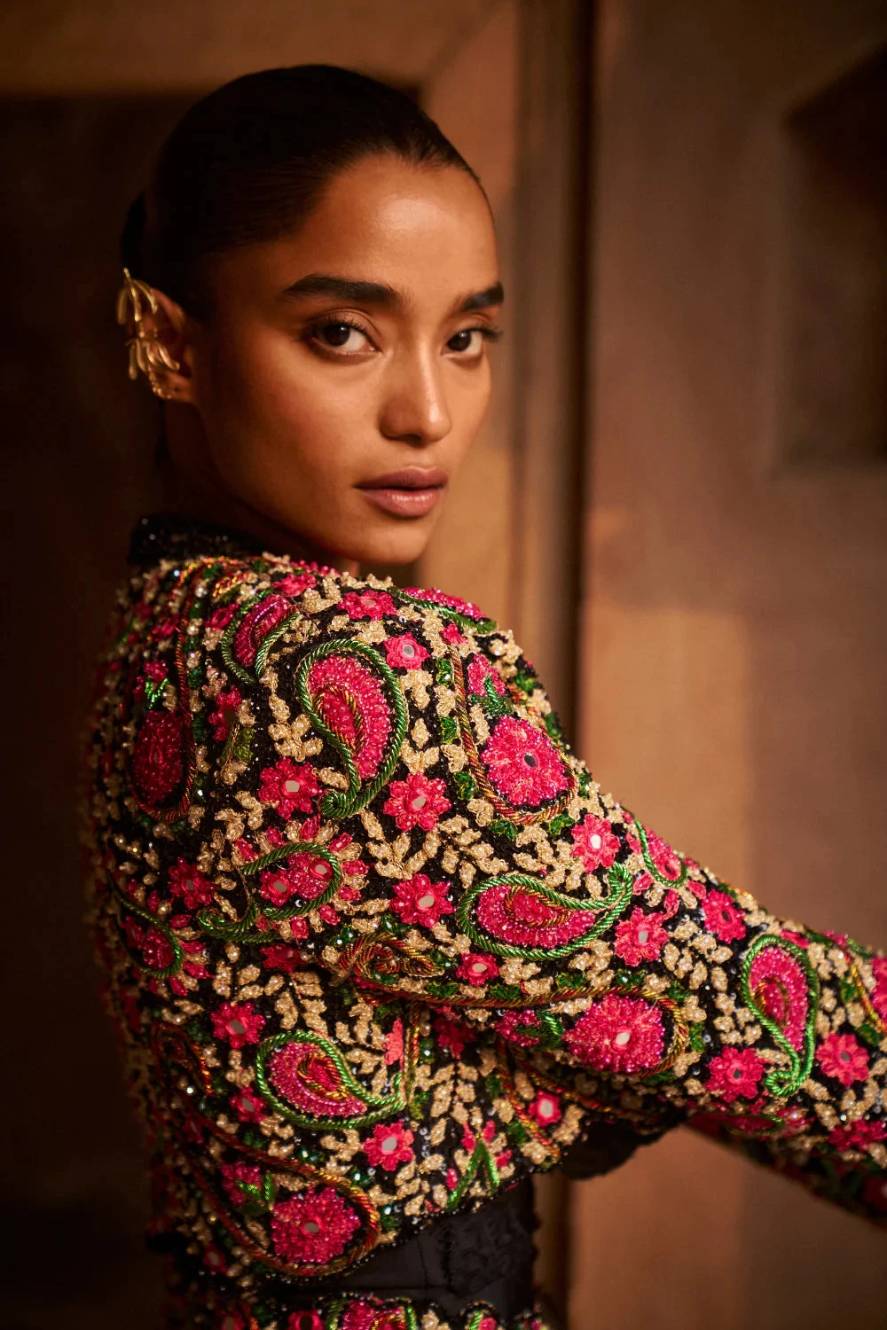 Crop Blazer: Multicoloured thread work base with crystal & mirror embellished open crop Blazer, cuff mirror work, half Mandarine collar