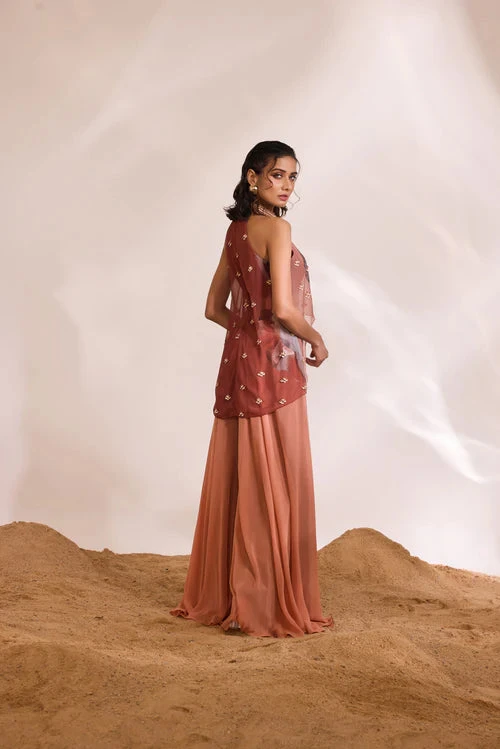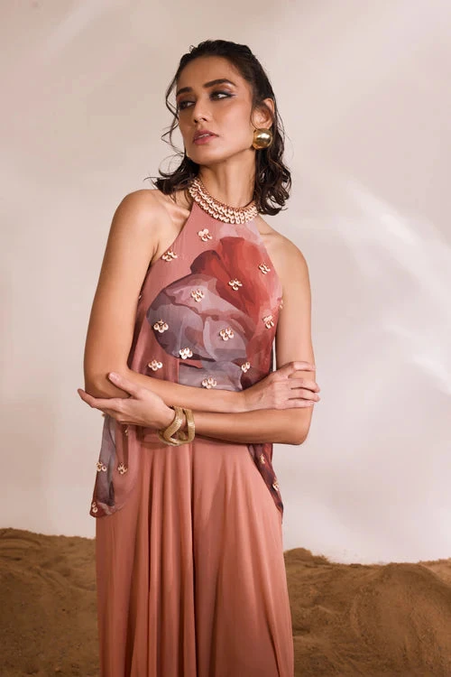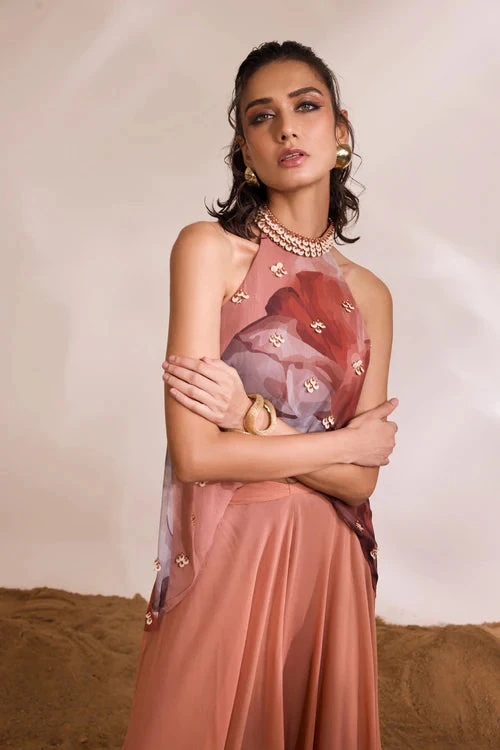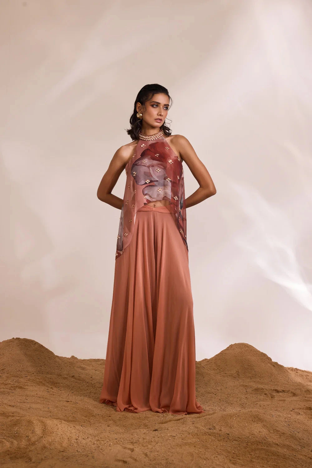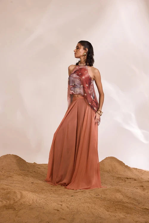 Immerse yourself in the captivating fusion of breezy silhouettes and scintillating elements with our FREYA Pant Set. This set features a halter neck top paired with flared pants, creating an alluring and exquisite look.