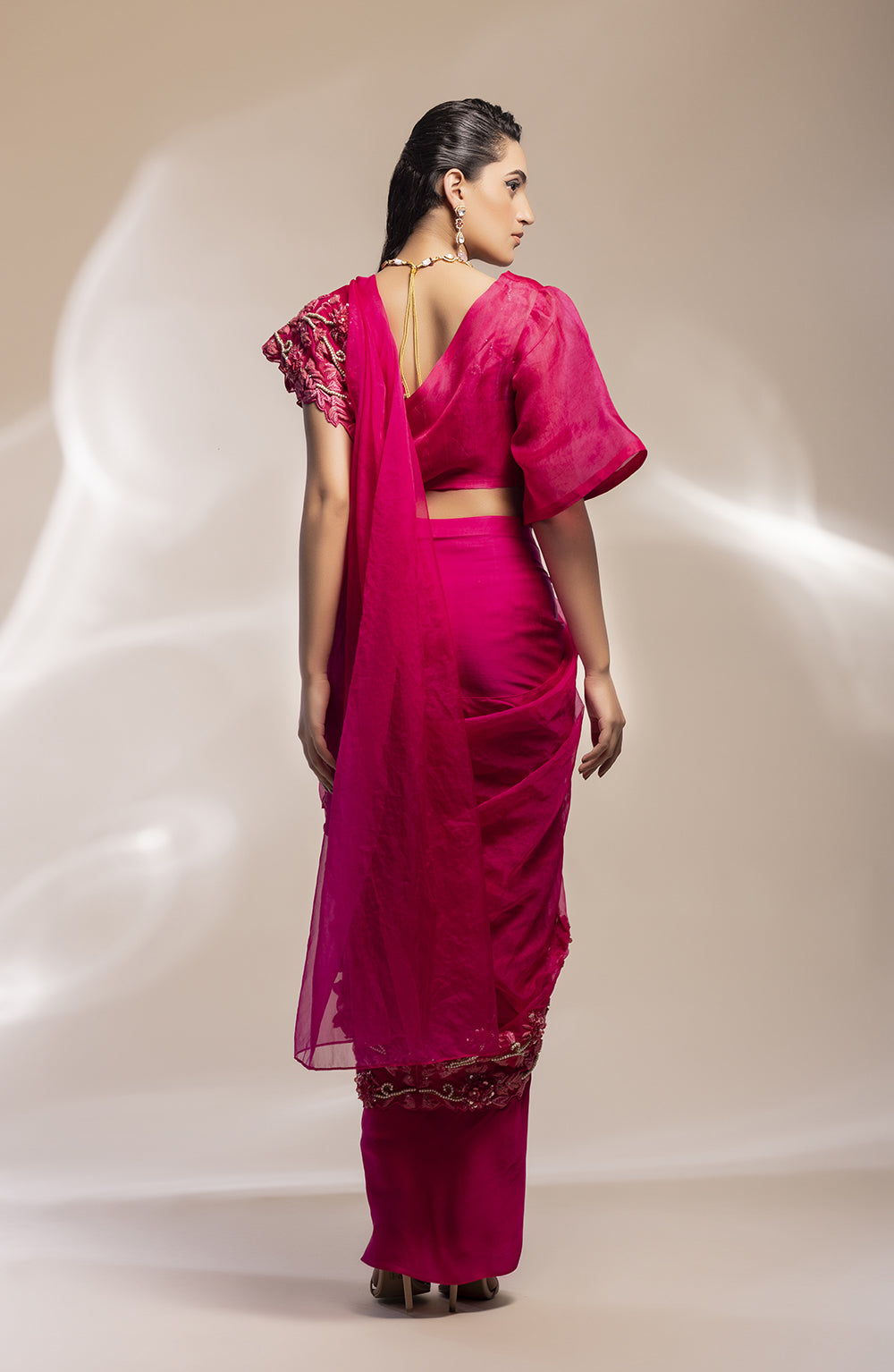 A Fuchsia asymmetrical modal satin drape concept saree with organza flowing gracefully from the waist to the pallu. The saree features an intricate three-dimensional threadwork pattern that is adorned with sequin, beads, and crystals, adding a touch of glamour. The saree comes with a sheer organza overlay blouse that is tied on the side. A short modal satin bustier is worn underneath the blouse.