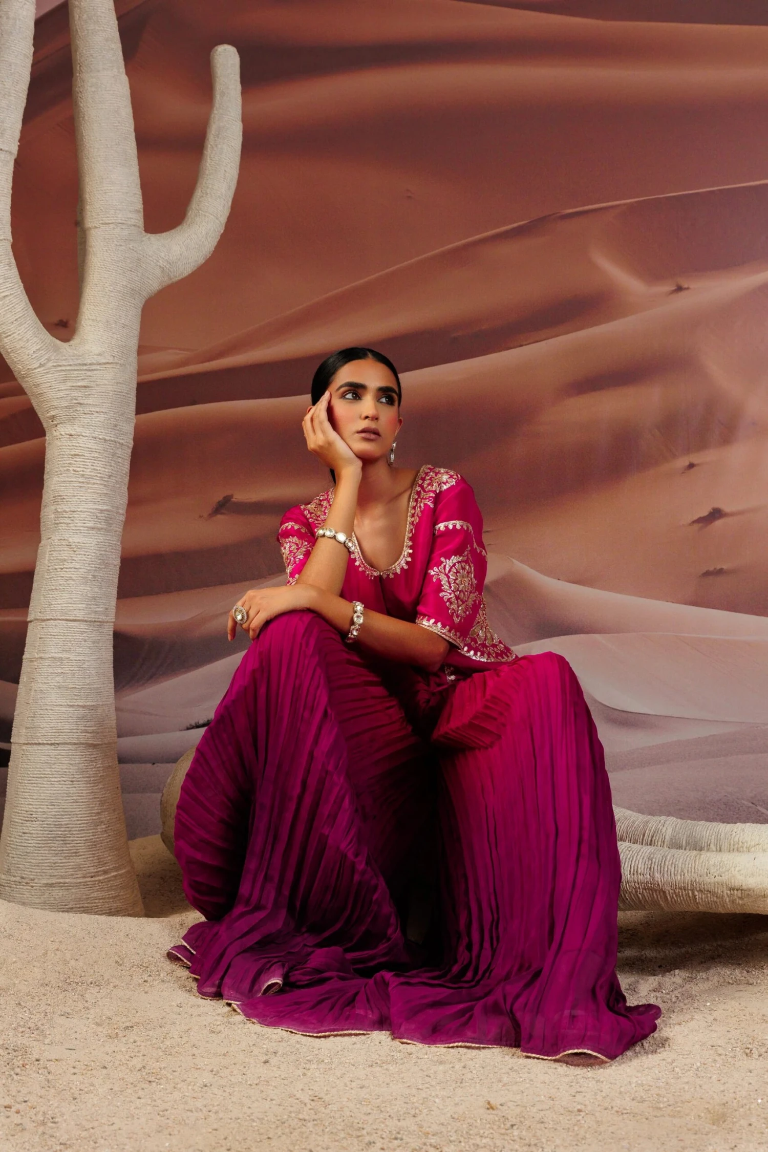 Fuschia Embroidered Jacket Top And Fushcia Purple Pleated Palazo Pant