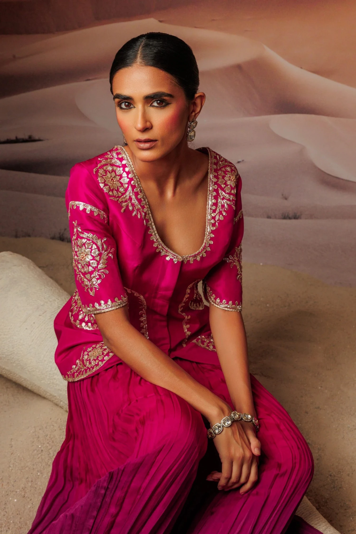 Fuschia embroidered jacket top and fushcia purple pleated palazo pant. The embroidery is a combination of pitta technique with gota, sequin, beads, zari and glass beads.