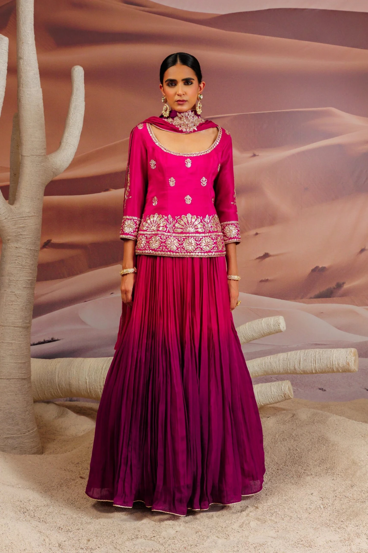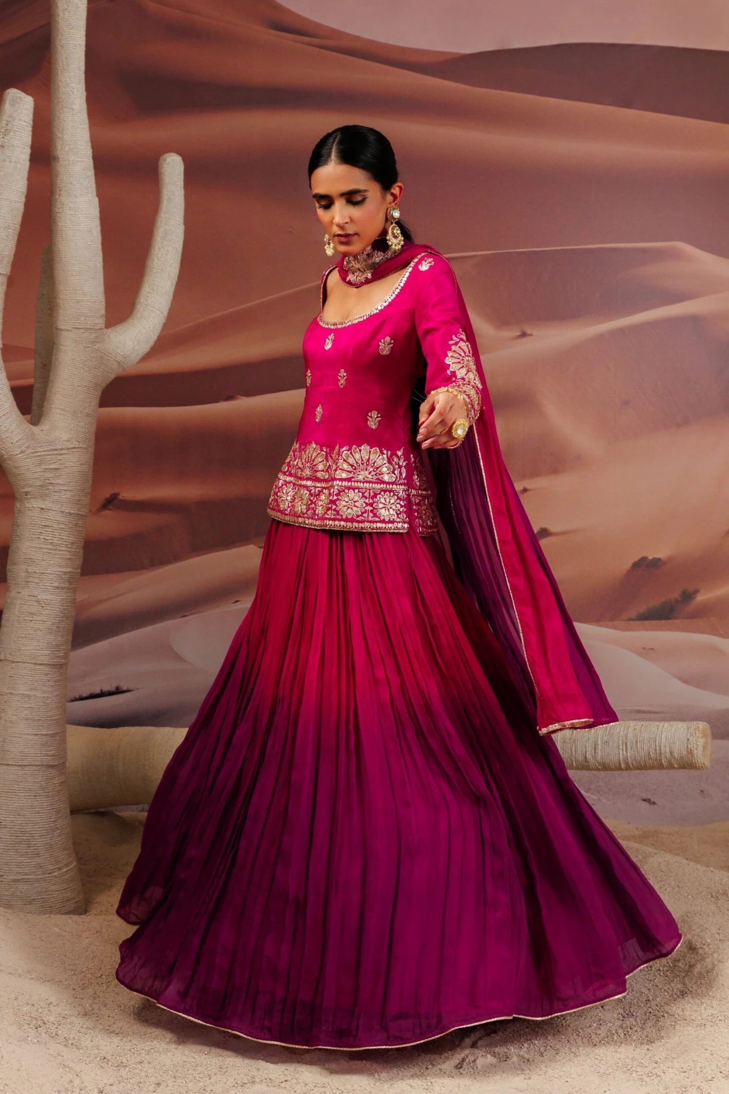Fuschia long straight blouse with broad U shape neck nd embroidery on the hem and neckline with fushcia purple shaded pleated skirt.the embroidery is a combination of pitta technique with gota, sequin, beads, zari and glass beads. The set comes with a pre-pleated organza georgette dupatta with embroidered boota in the center as shown.