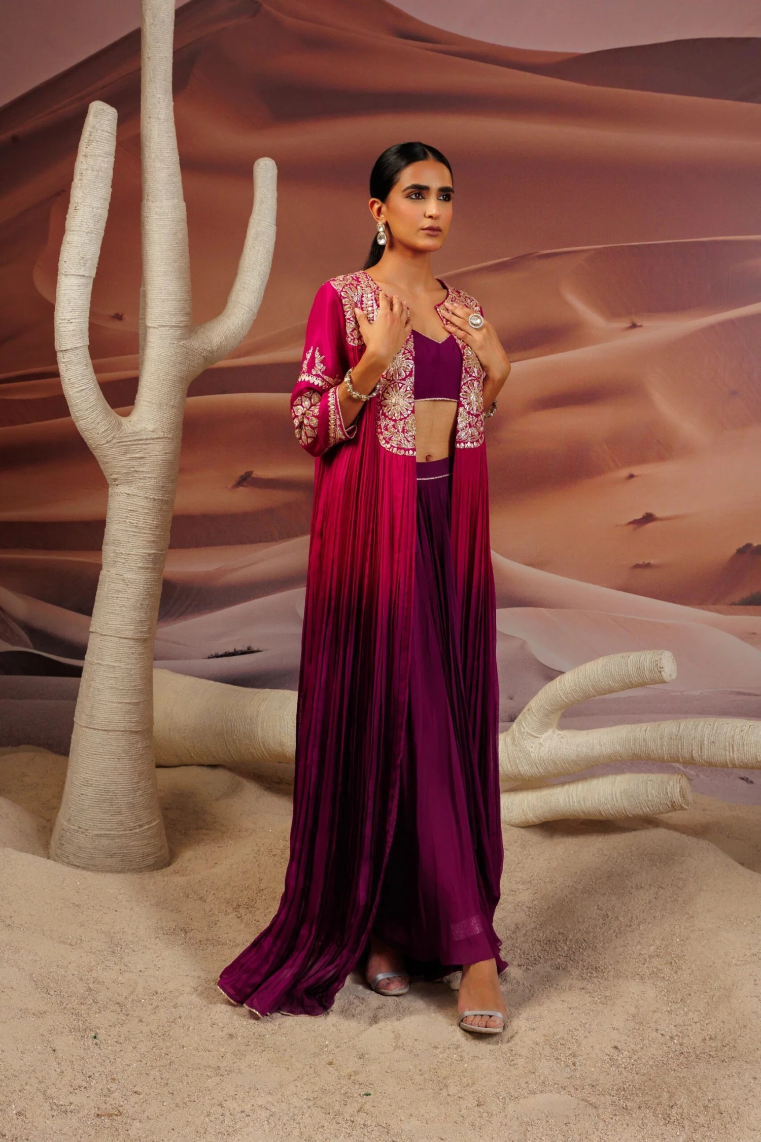 Fuschia Purple Shaded Pleated Cape With Embroidered Yoke And Sleeve