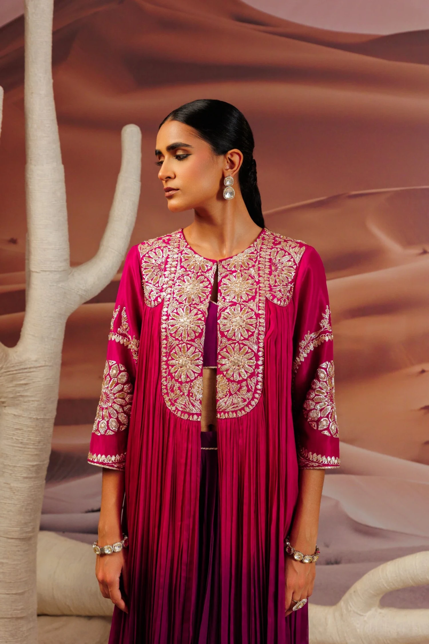 Fuschia purple shaded pleated cape with embroidered yoke and sleeve combined with blouse and drape skirt in purple colour. The embroidery is a combination of pitta technique with gota, sequin, beads, zari and glass beads.