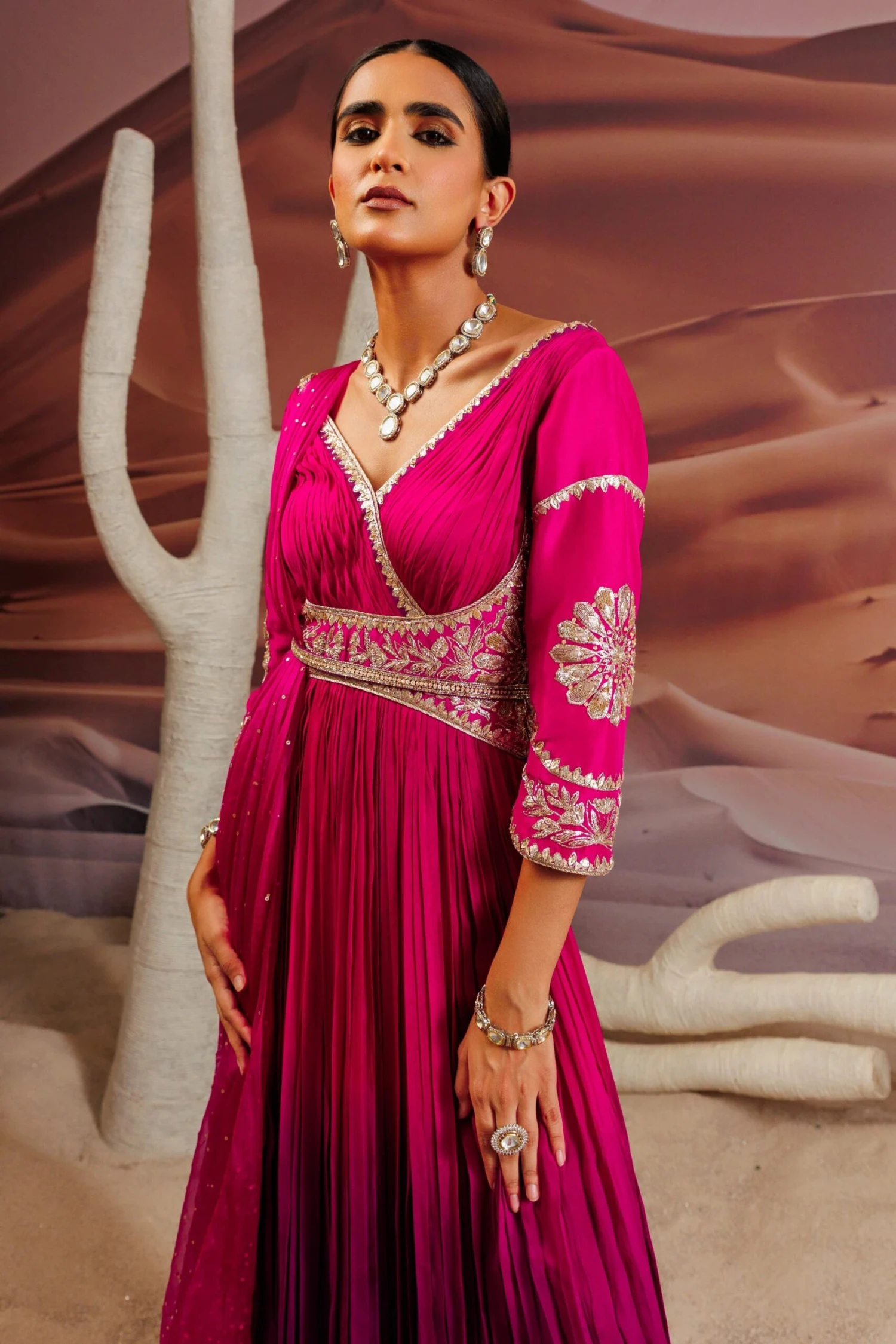 Fuschia Purple Shaded Pleated Flare Anarkali