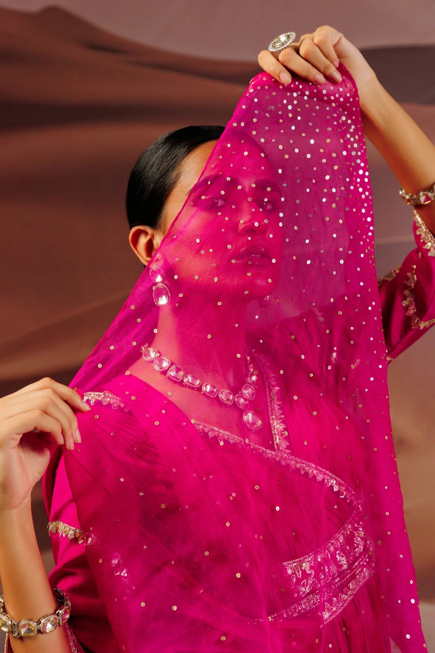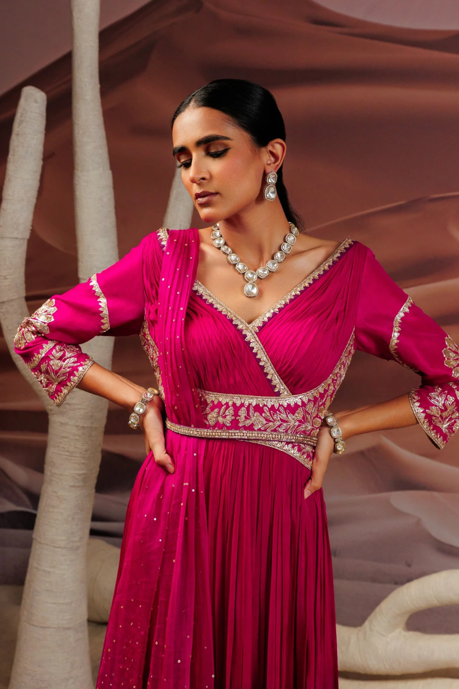 Fuschia purple shaded pleated flare anarkali with embroidered choli cut yoke and sleeve.the embroidery is a combination of pitta technique with gota, sequin, beads, zari and glass beads. The set comes with a pre-pleated organza dupatta with sequin chitta and embroidered belt.