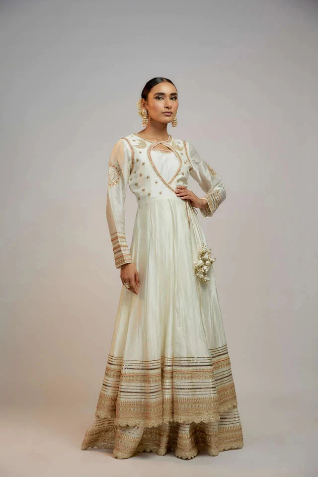 This design embodies grace and poise with its intricate design and flowing silhouette. This regal ensemble seamlessly marries traditional elements with historic aesthetics, ensuring you stand out with a timeless appeal at any special occasion.