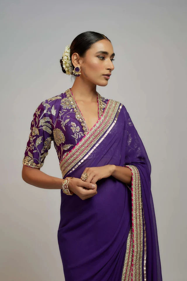 A classic chiffon saree with delicate gold embroidery gracefully lifts the patterns, adding grace. Paired with a beautiful brocade and zardosi blouse, exudes opulence and grandeur reminiscent of royalty.