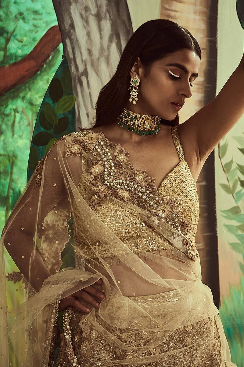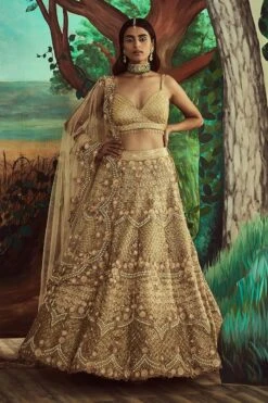Gold trail lehenga set embroidered with tonal Resham & zari highlighted with sequins, crystals and cutdana.