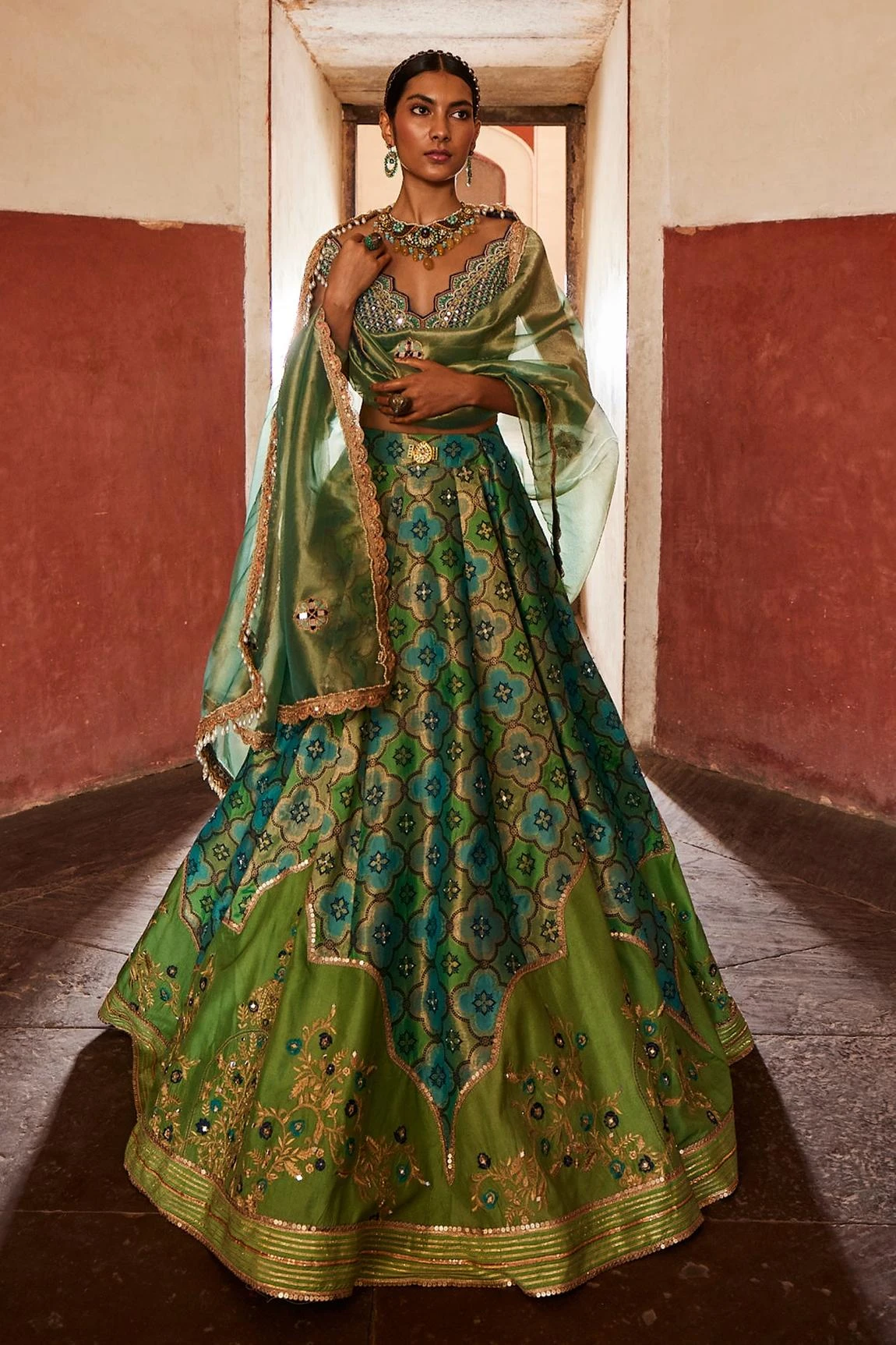 Green A-line flare lehenga with all over quatrefoil floral pattern, highlighted with jharokha inspired embroidery on the border with flower vine detailing. Paired with a padded blouse, accentuated with cut mirrors, zardozi and pearls. Comes along with an embroidered border dupatta.
