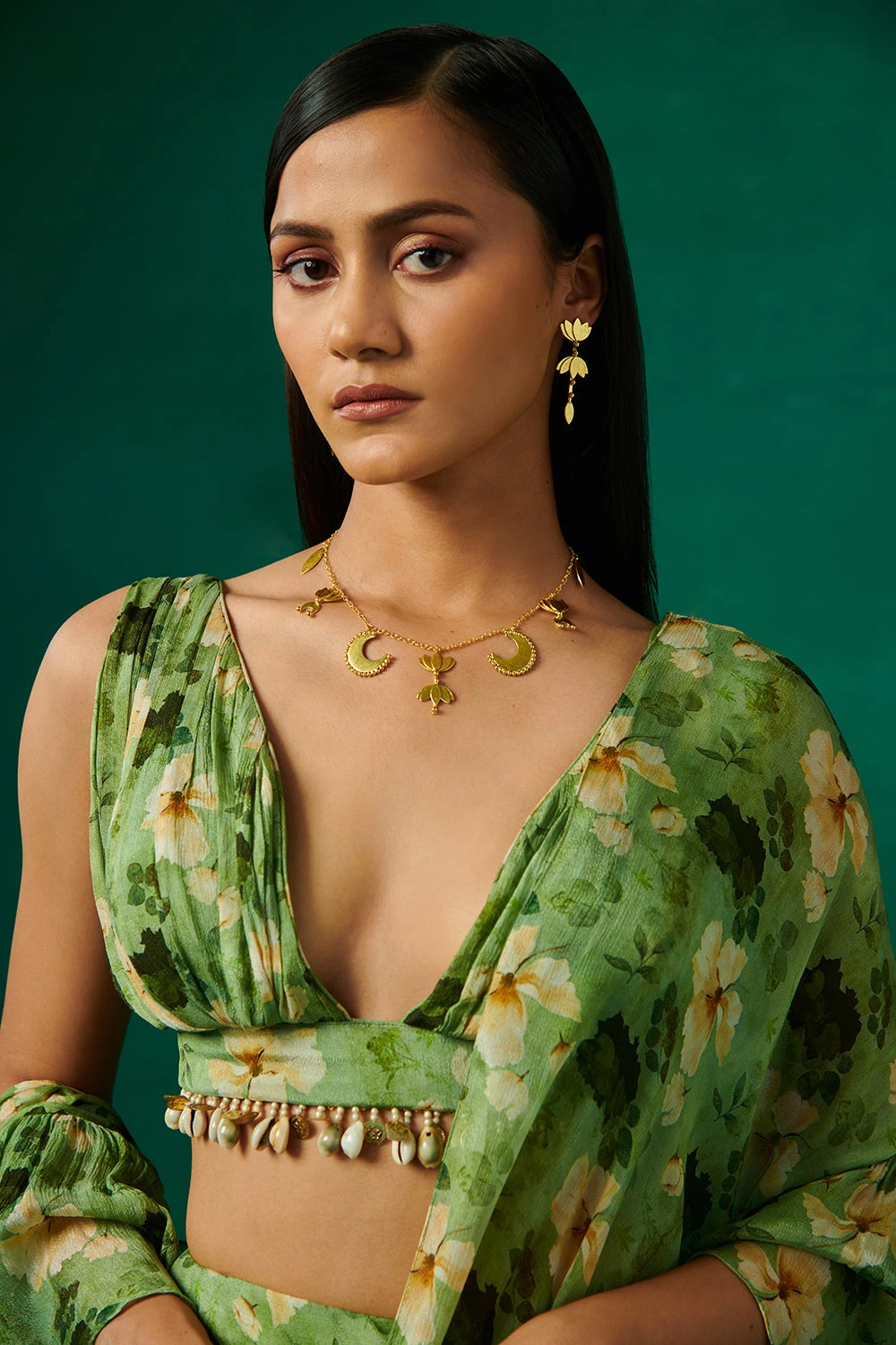 Green Floral Print Drape Saree With Ruffles And Plunge V Neck Blouse