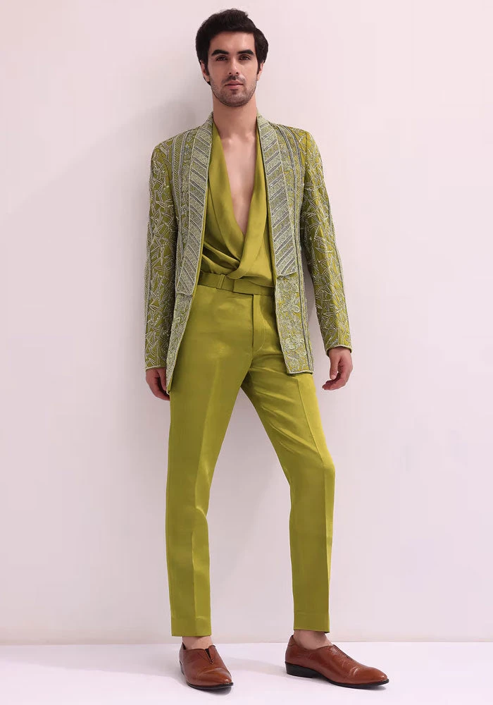 - this green lapel-stylized tuxedo is adorned with hand embroidered cutdana and silver hued accents. Complemented with a matching shirt and straight pants.