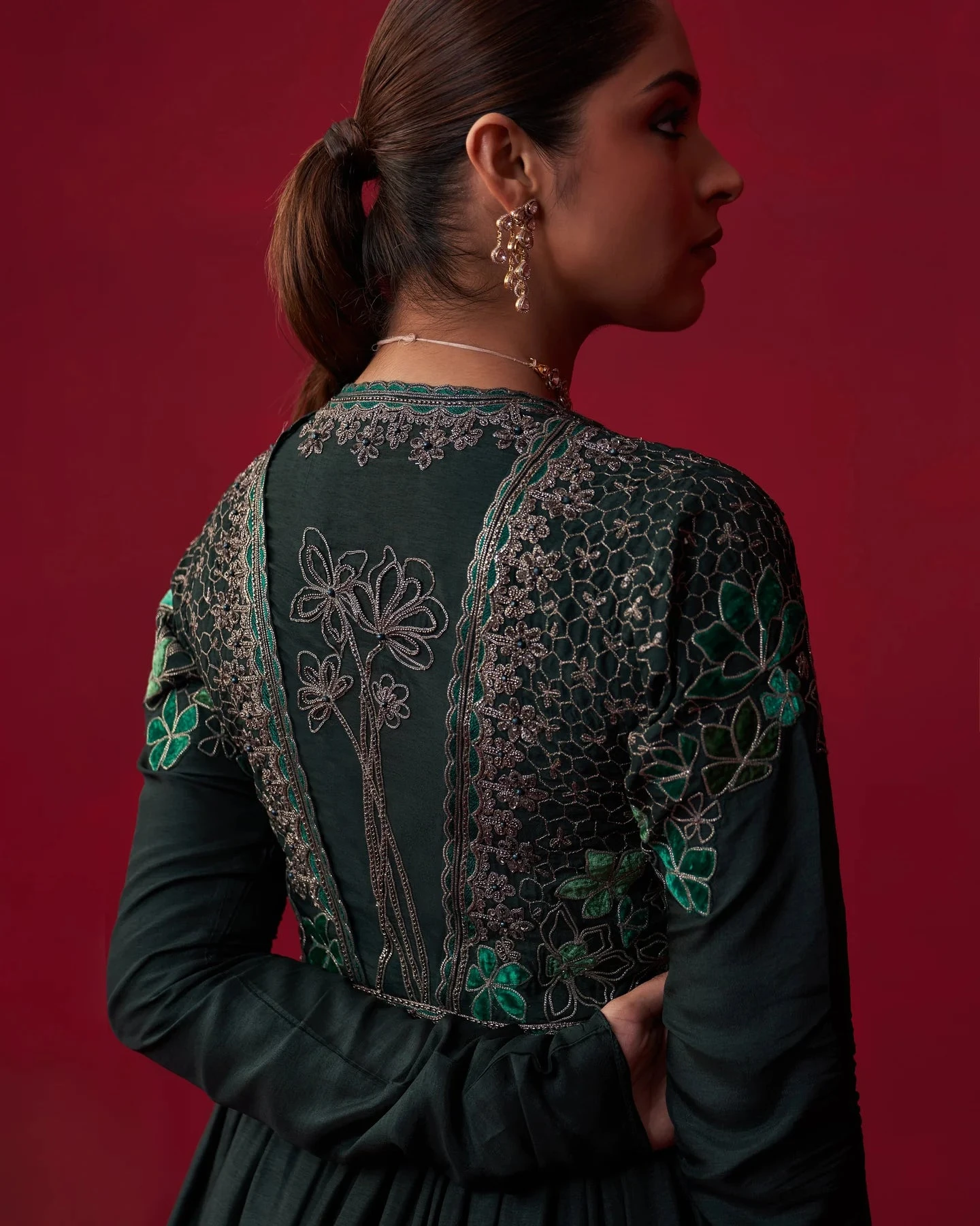Green Russian Silk short Anarkali with velvet patch embroidered bodice, paired with sharara