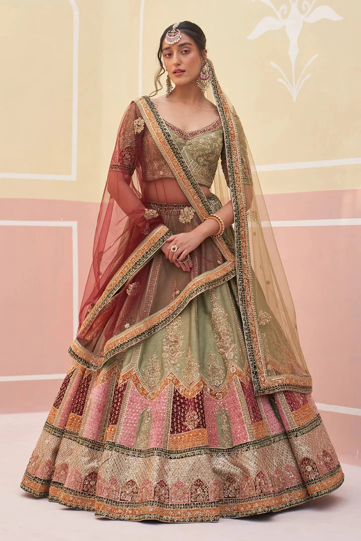 A green double dupatta lehenga set embroidered with traditional zardozi technique using silken threads, dabka, cutdana and sequins underlayed with multi colored velvet appliques.