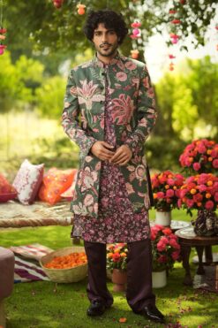 Jade kurta with floral woven motifs, loop detail & fringe detail. Comes with a churidar.