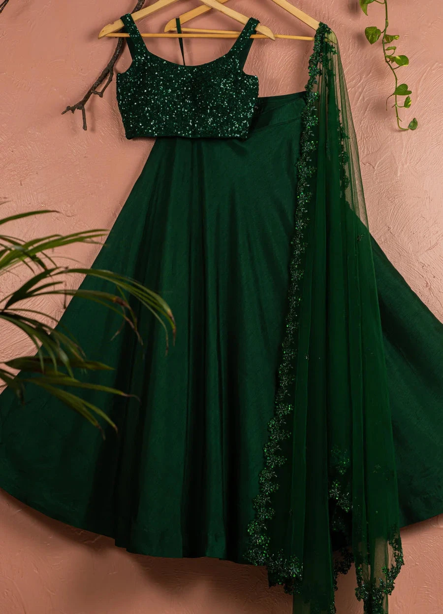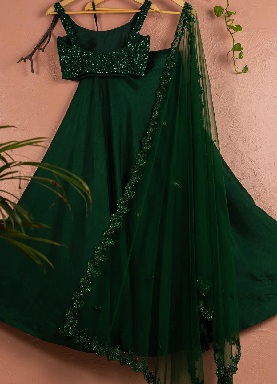 Raw silk lehenga set with sequin net blouse and net hand embroidered dupatta with cutwork