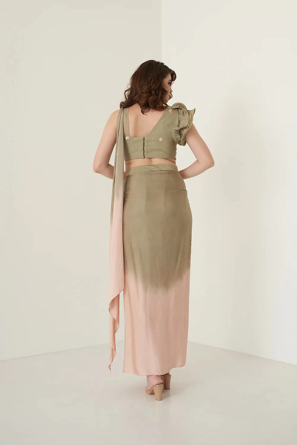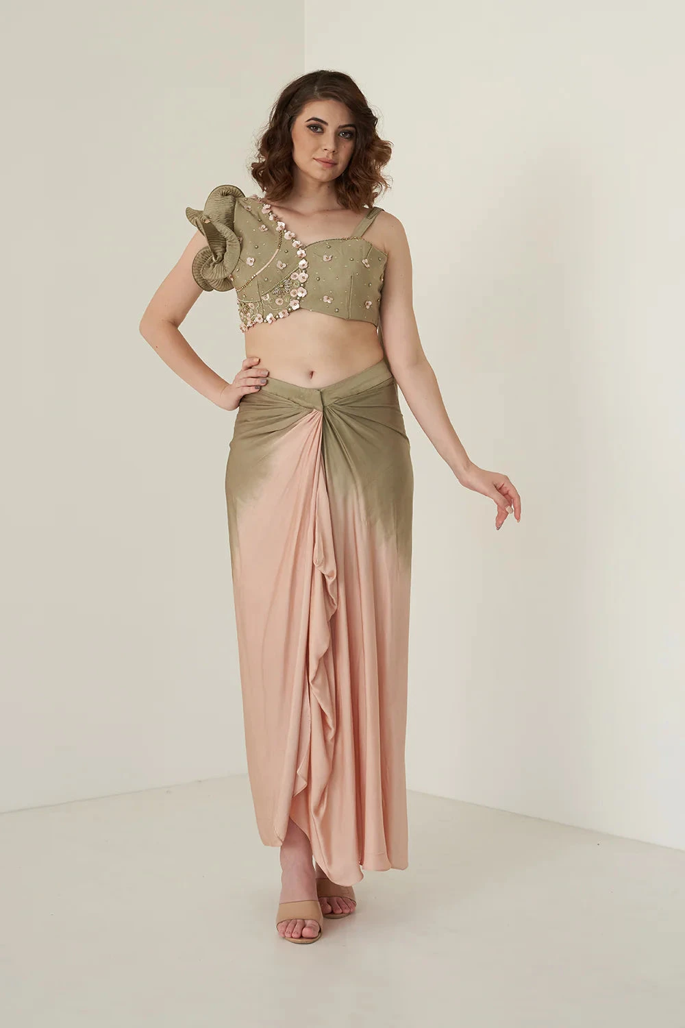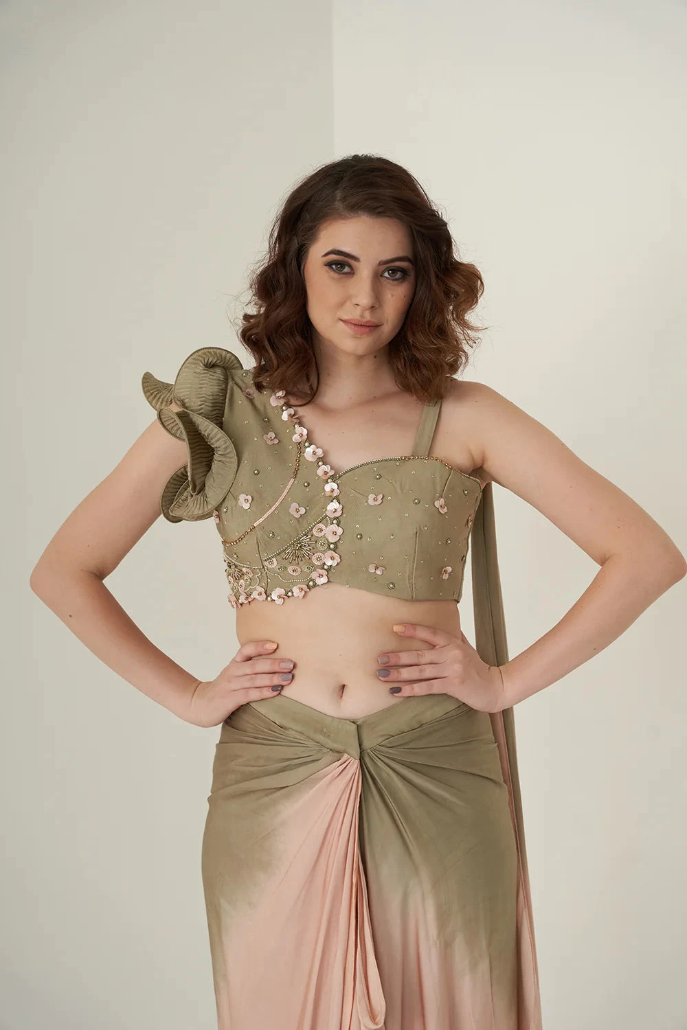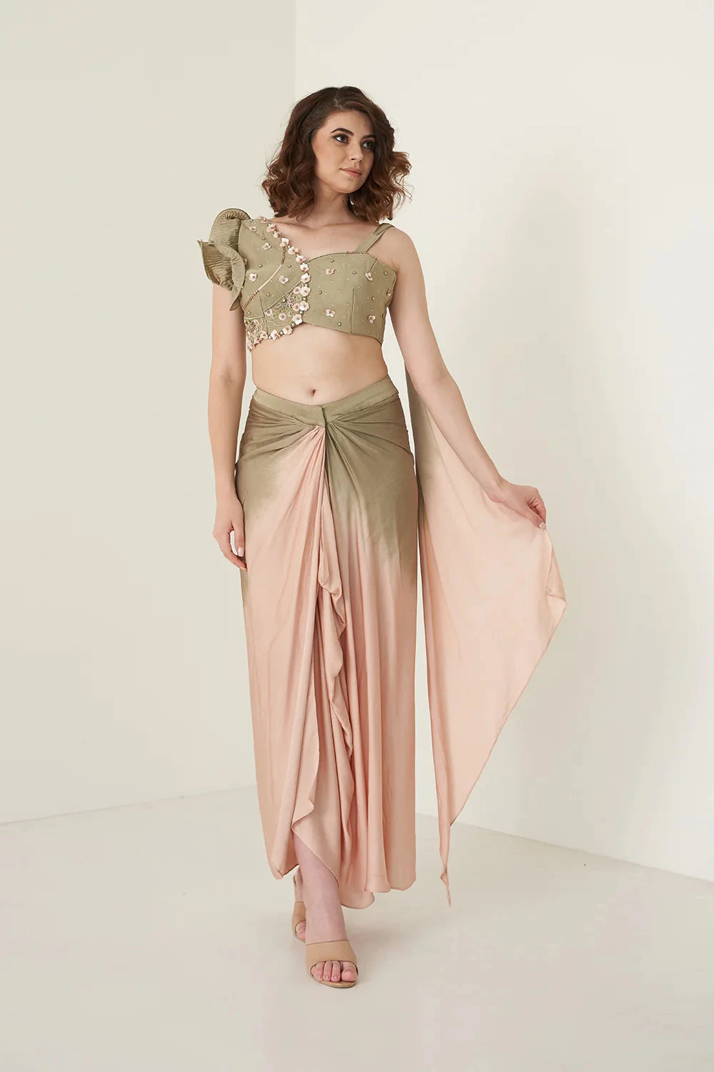 Co-ord Set Comes With Shaded Dhoti Skirt And Embroidered Blouse Having One-sided Pleated Structured Sleeve And A Fall On The Other Side.