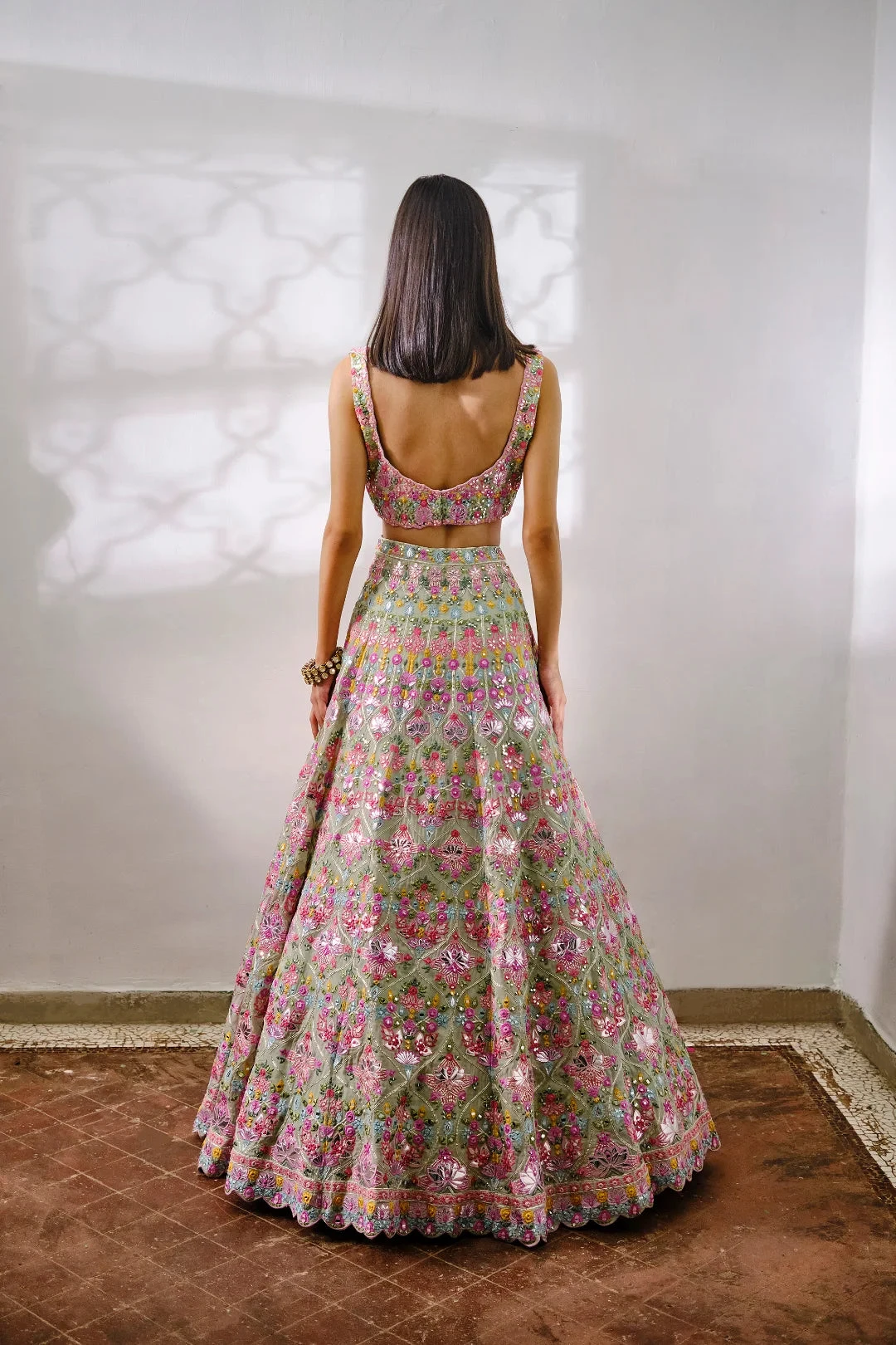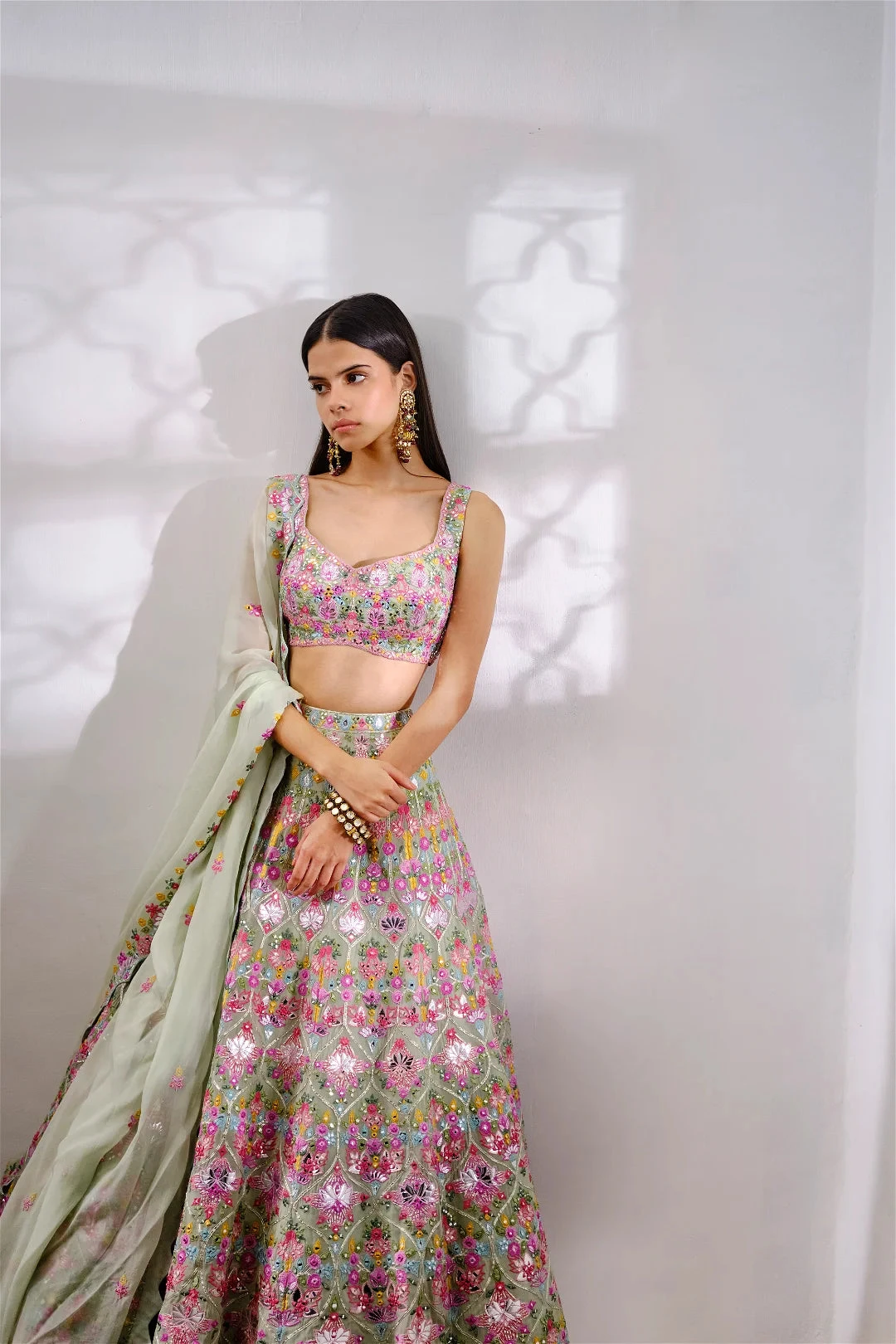 - Featuring A Green Soft Organza Lehenga With Vases And Floral Motif Pattern All Over.
