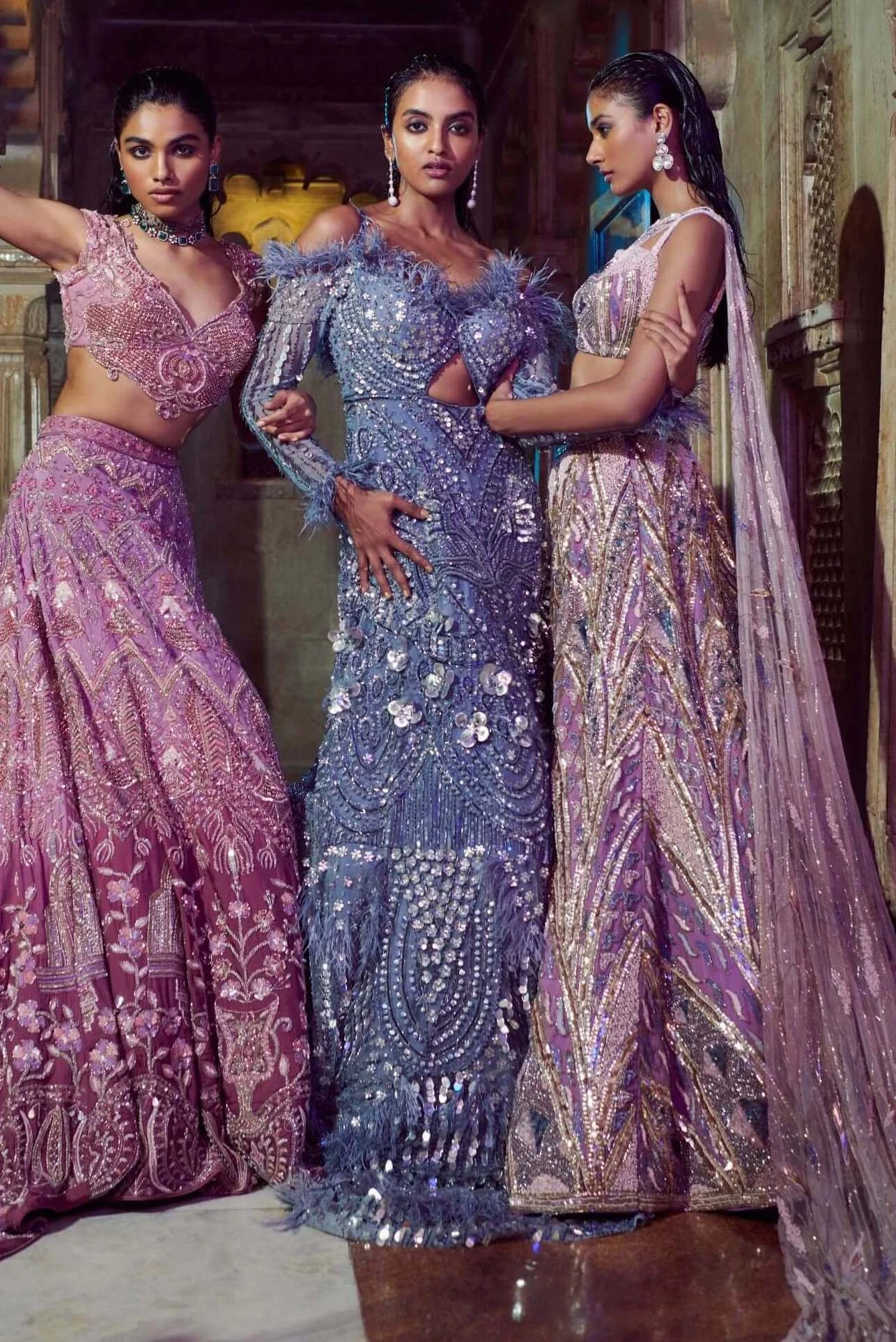 This mysterious steel grey gown sparkles with assorted sequins speaking of the individualistic moods of modern Indian culture. The gown is styled with an off-shoulder neckline.