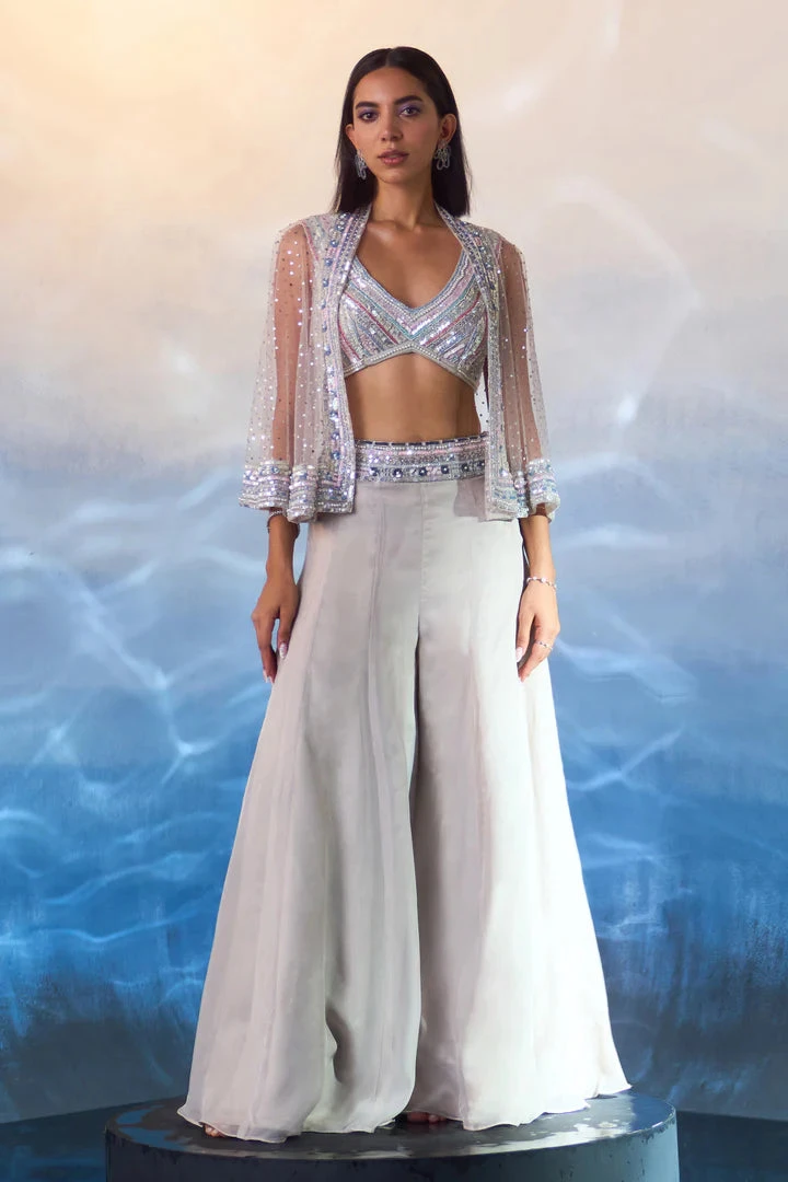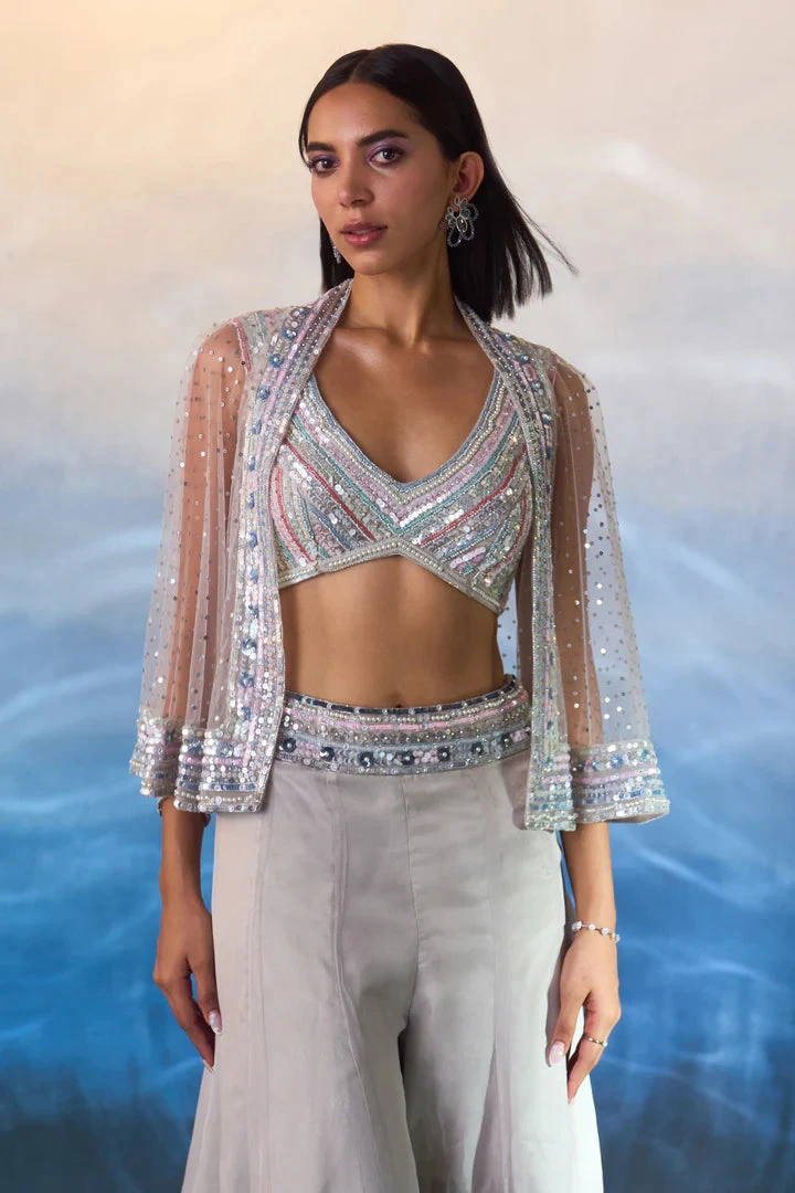 A grey organza cape set embroidered with silver and tonal sequins and crystals.