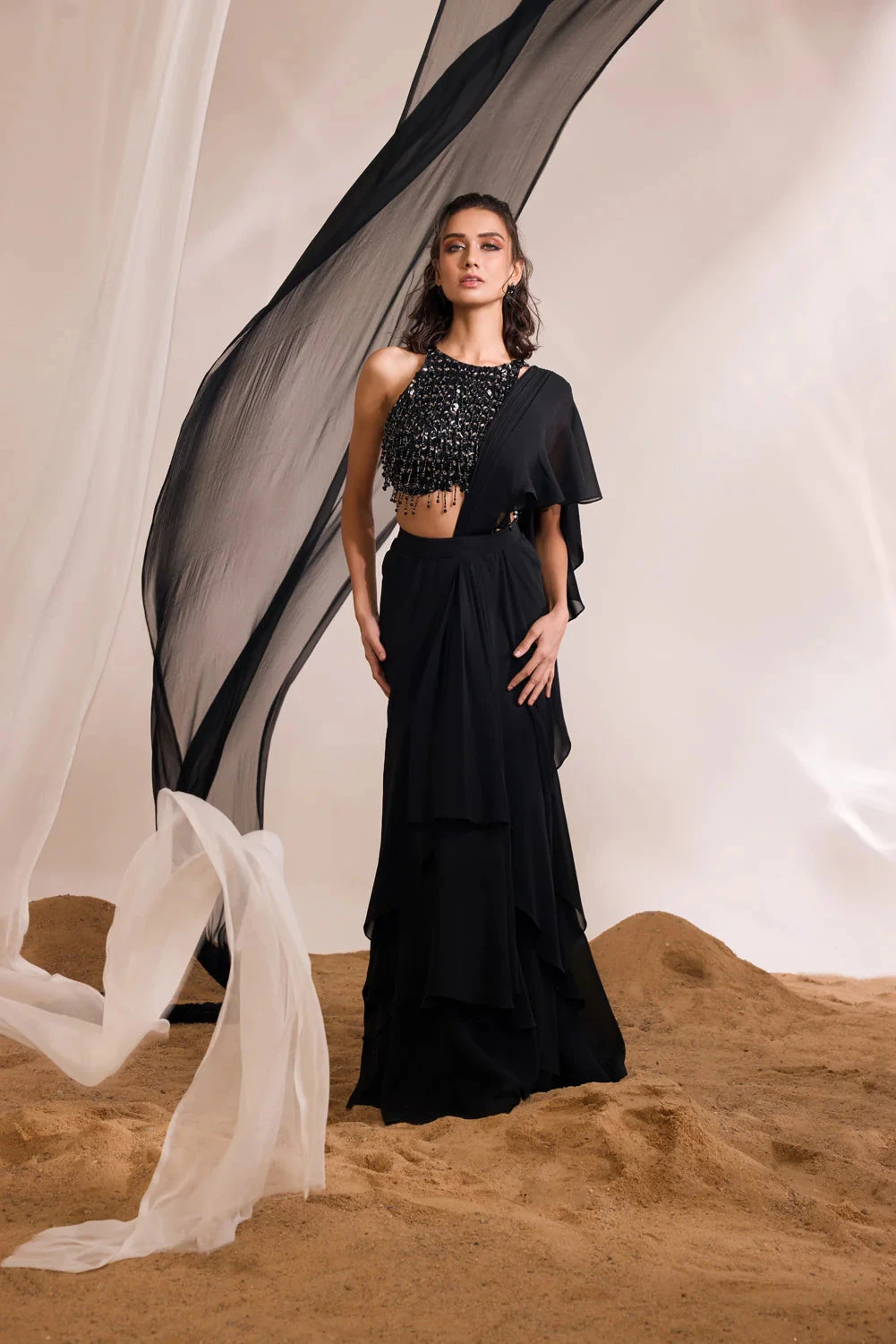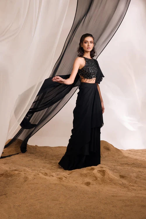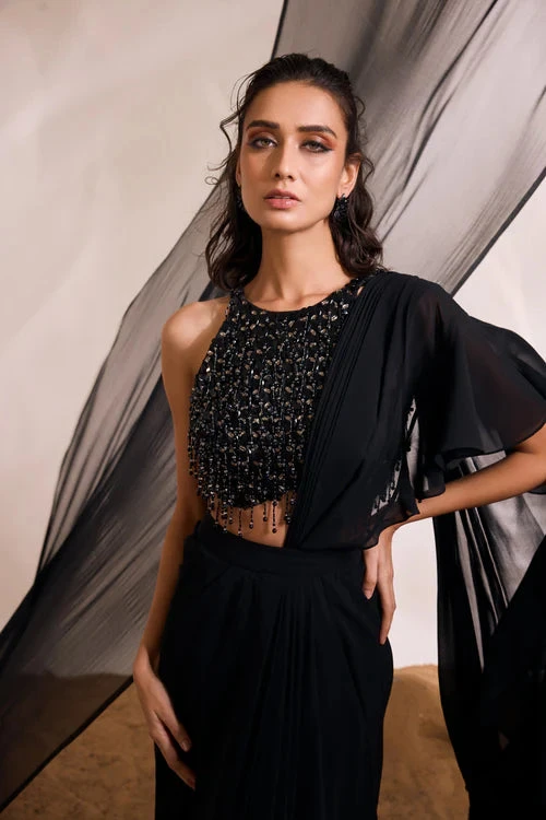 Make a bold statement with our HAILEY Saree Set, a fusion of modern sophistication and traditional charm. The ensemble includes a heavily embellished backless blouse with elegant tassel accents, paired with a concept drape saree for an enchanting and distinct look.