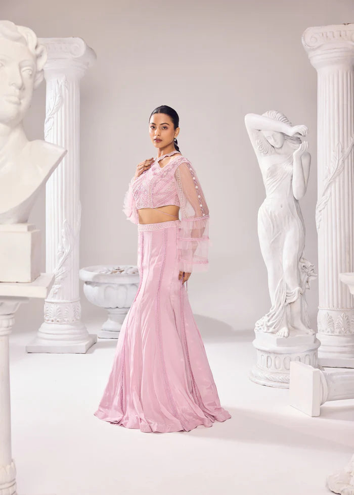 From the soothing colours that speak to your soul, this ensemble is a perfect set for this blooming summer season. Our intricately embroidered bodice with pearl and lace detailing further highlighted with net ruffle bell sleeves, paired with a breezy summer fabric, Crepe, in a fishcut Lahenga with pearl and lace detailing is a perfect illustration of comfort and finess for you.