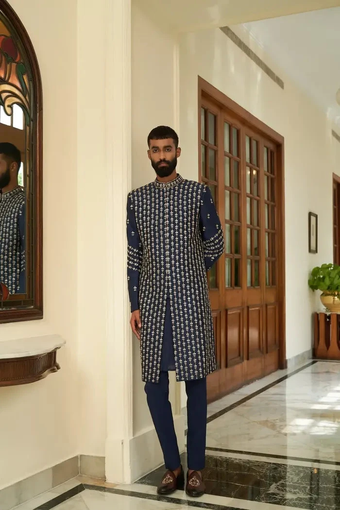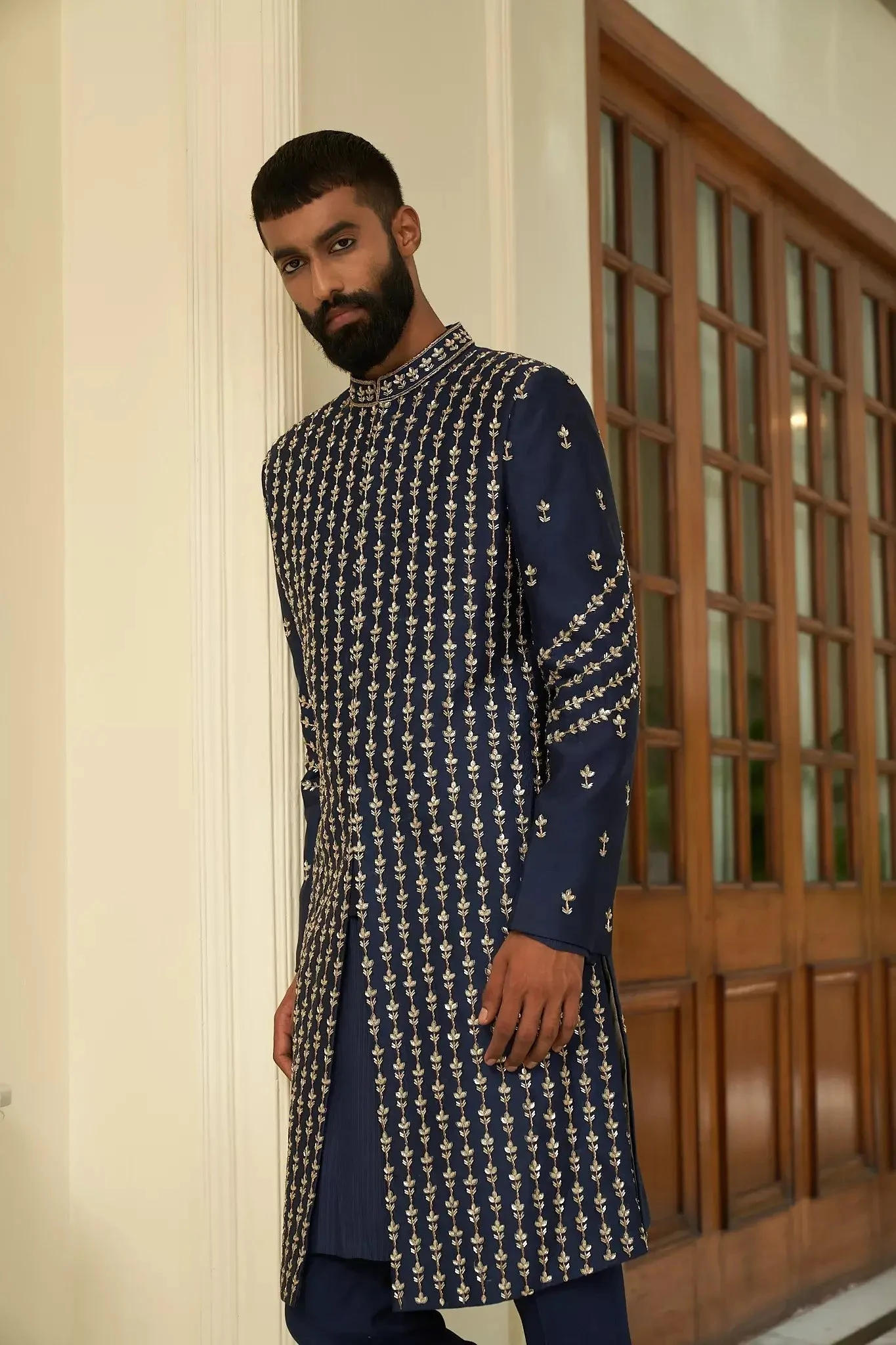 An array of light and life,this sherwani showcases our best craftsmanship with a vertical play of embroidery,all over creating a jaal