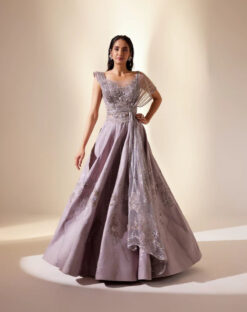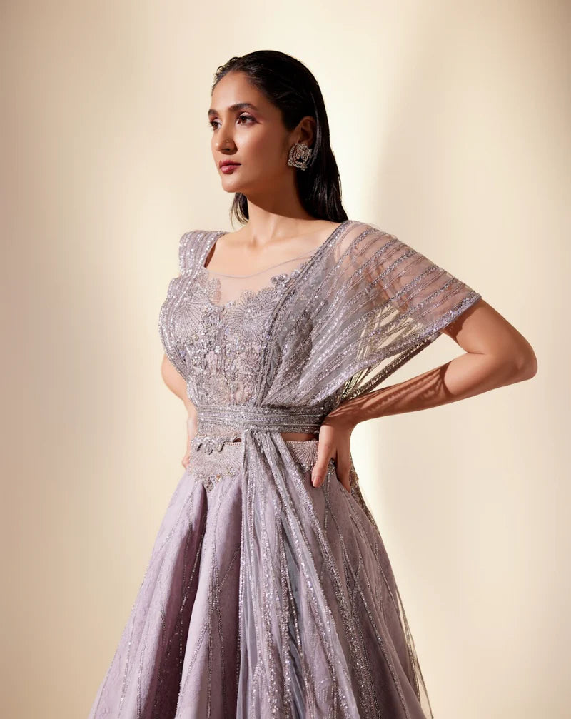 Lilac Lehenga set with attached dupatta adorned with shimmer Sequins and delicate lace detailing,