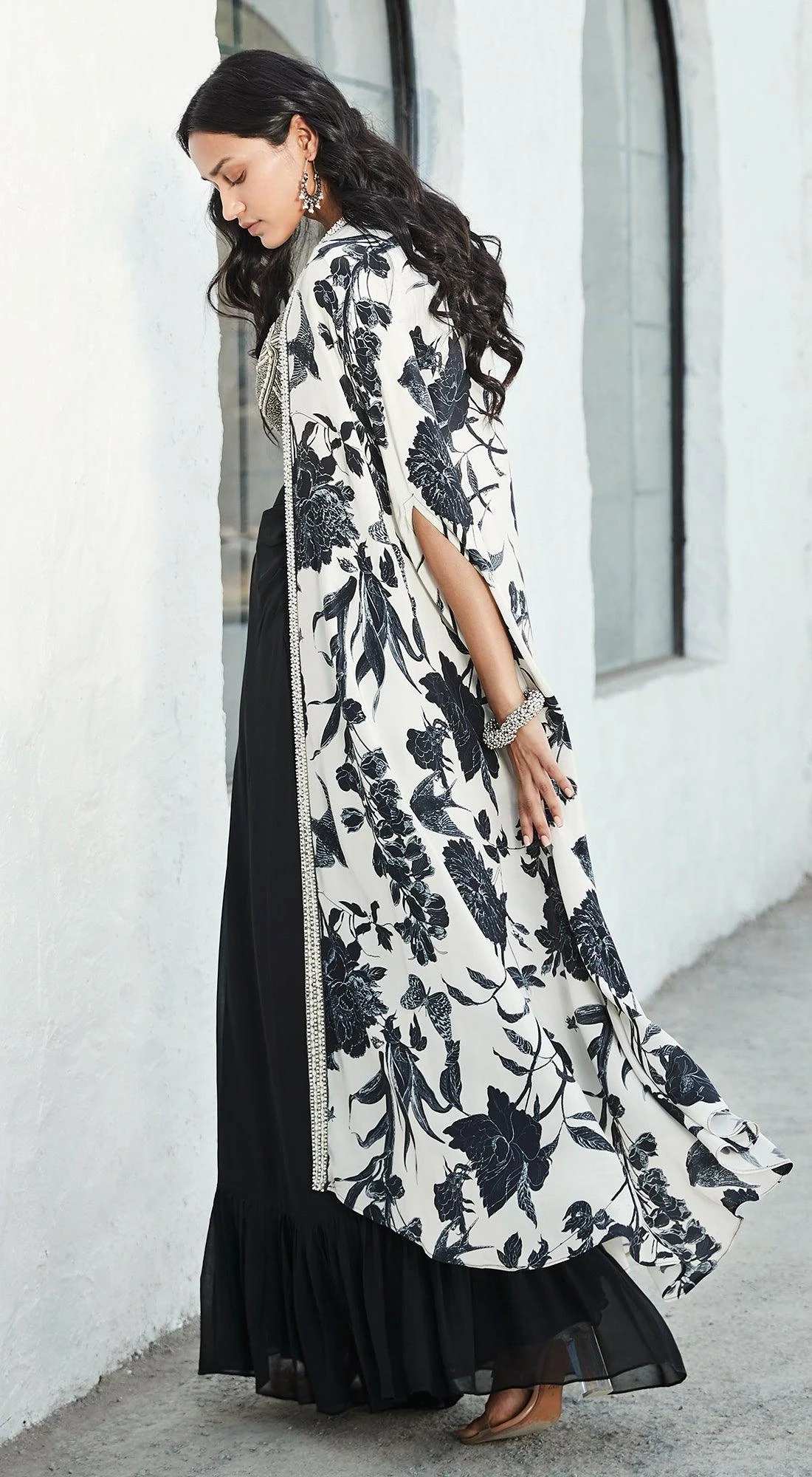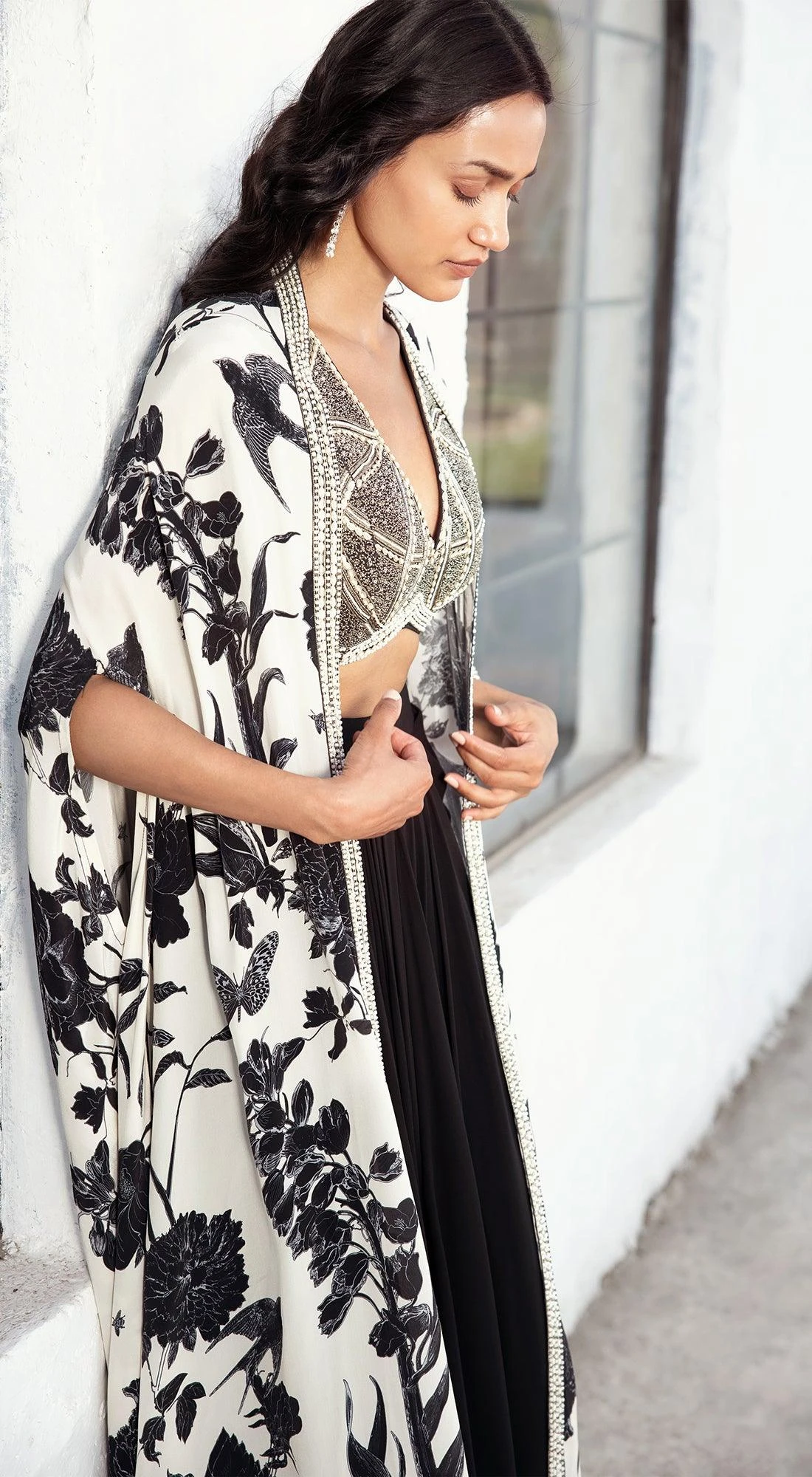 A glam concoction of craft & culture, this ivory and black skirt set is a destination wedding dream! It comprises a hand-embroidered viscose silk blouse featuring sequins, cutdana, moti, zari with a plunging neckline, and a long crepe floral cape with embroidered borders. The skirt is all-black and crafted in luxe crepe for added volume.