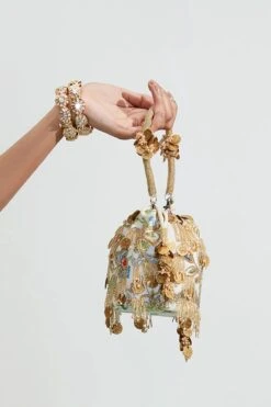 Featuring an Ivory bucket bag in (fabric name ) base with Aari work of round beads and beagle beads followed by intricately embroidered pearl and coin tassels. The bag comes with a beautifully carved handle in beads, coins and pear tassels.