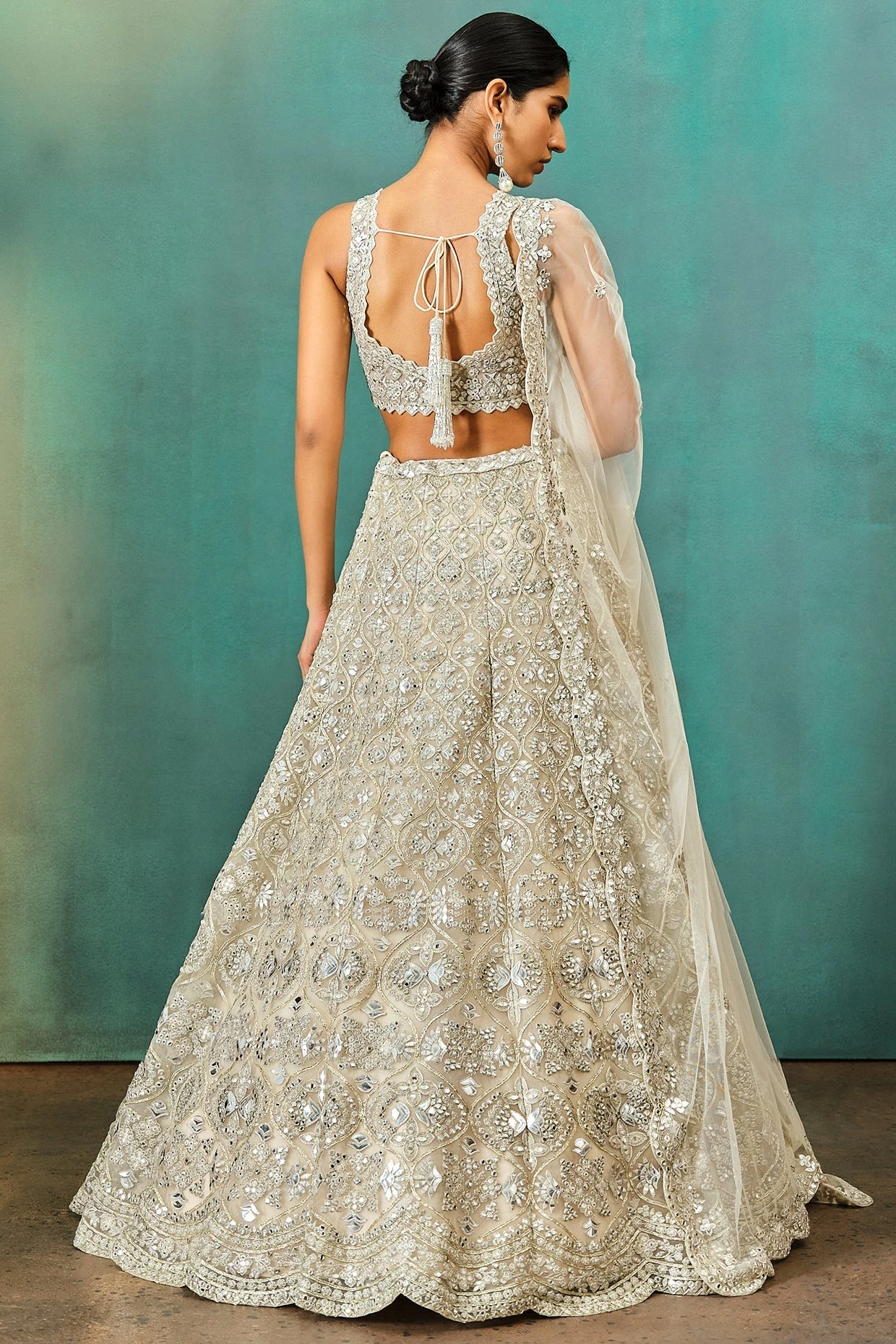 Featuring An Ivory Motif Net Lehenga With a Big To Small Motif Pattern All Over. It Is Embroidered With Zari, Foil Applique, Thread And Mirror. It Comes Along With A Matching Front Open Blouse And Dupatta.