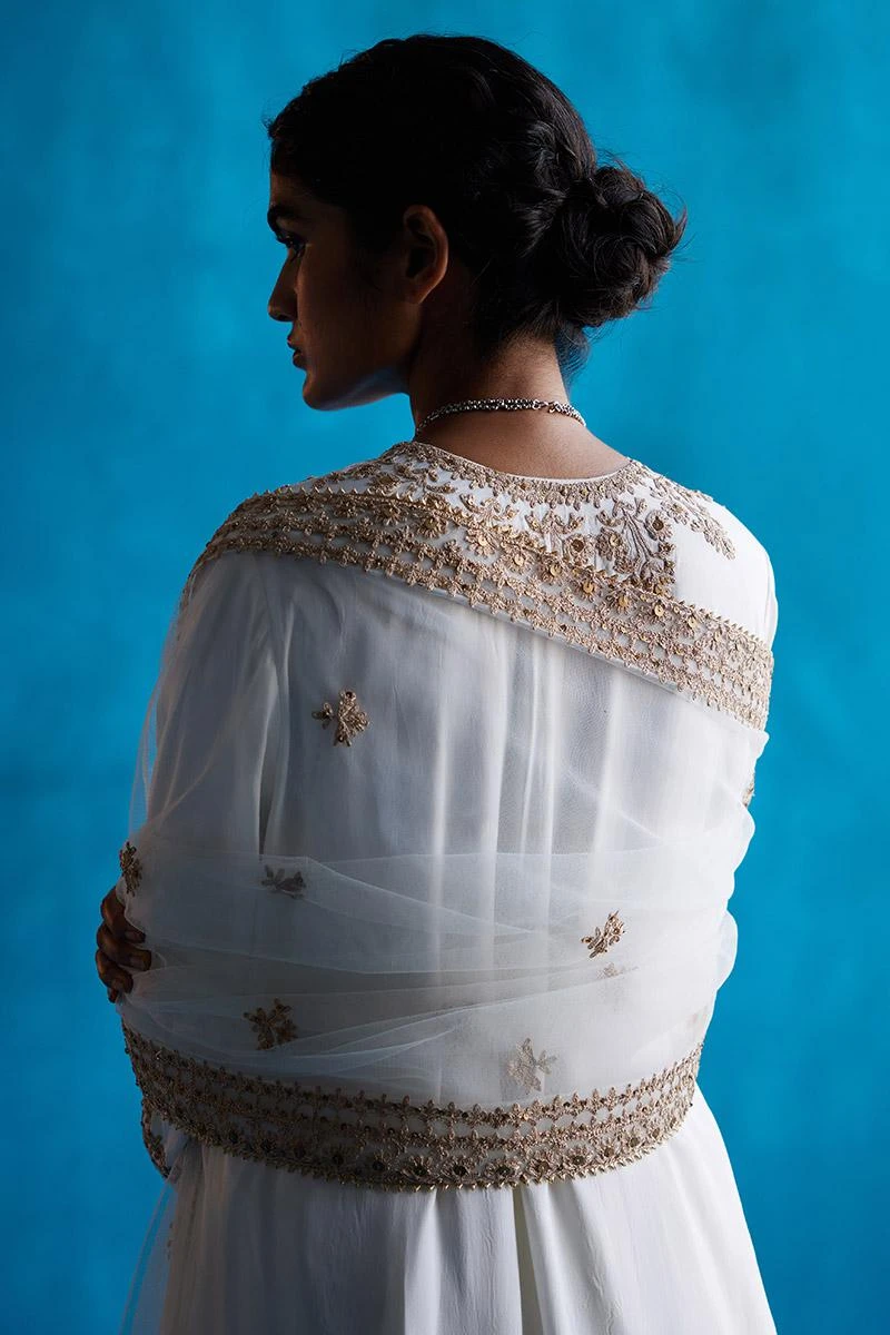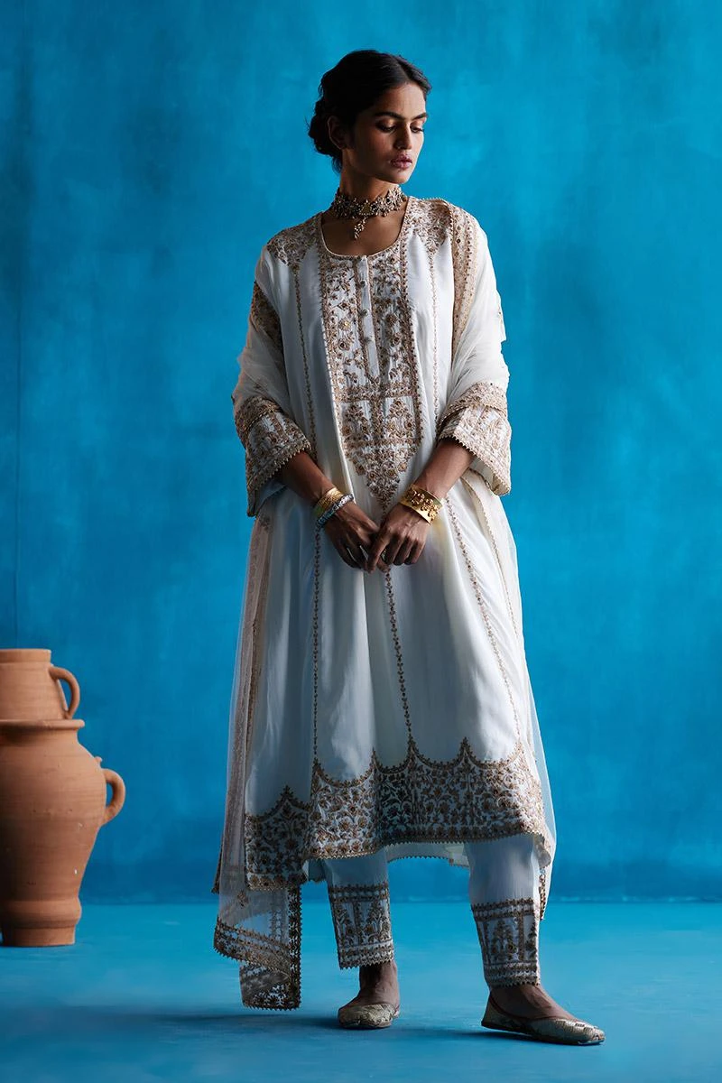 Ivory straight kurta with contrast Kasab, tilla and sequin embroidery. Comes with a salwar and embroidered net dupatta.