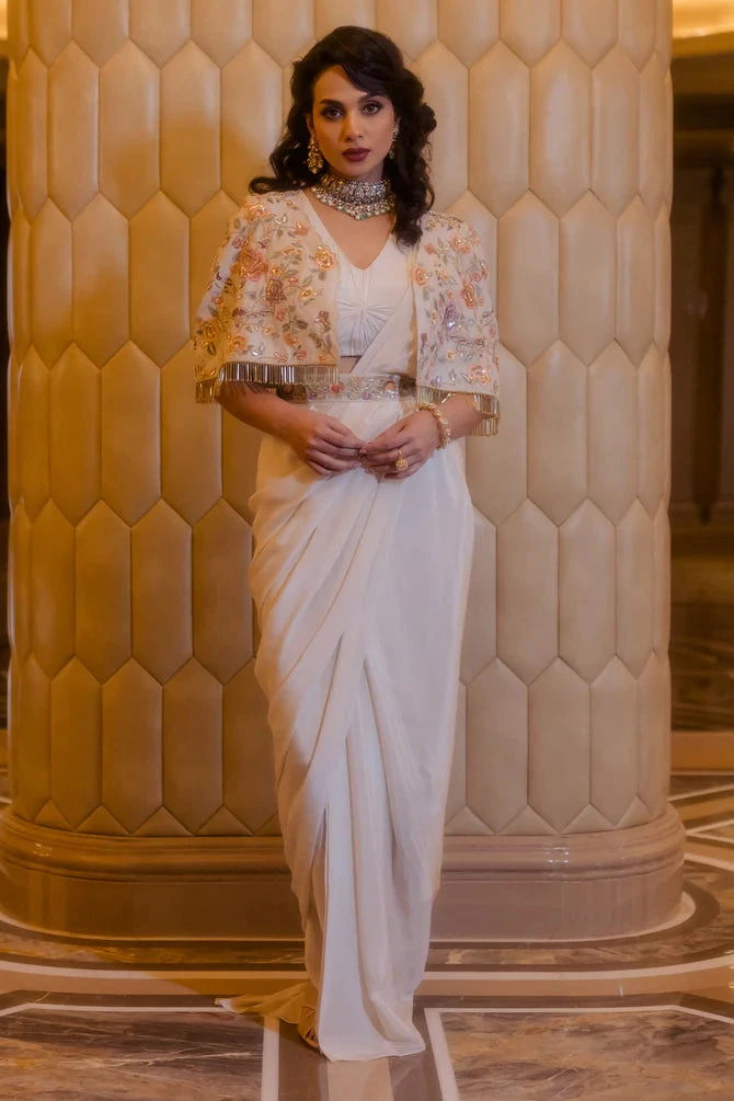 An ivory roman draped pre-stitched saree paired with crepe blouse and the most stunning hand–embroidered chidiya embroidery cape and belt.