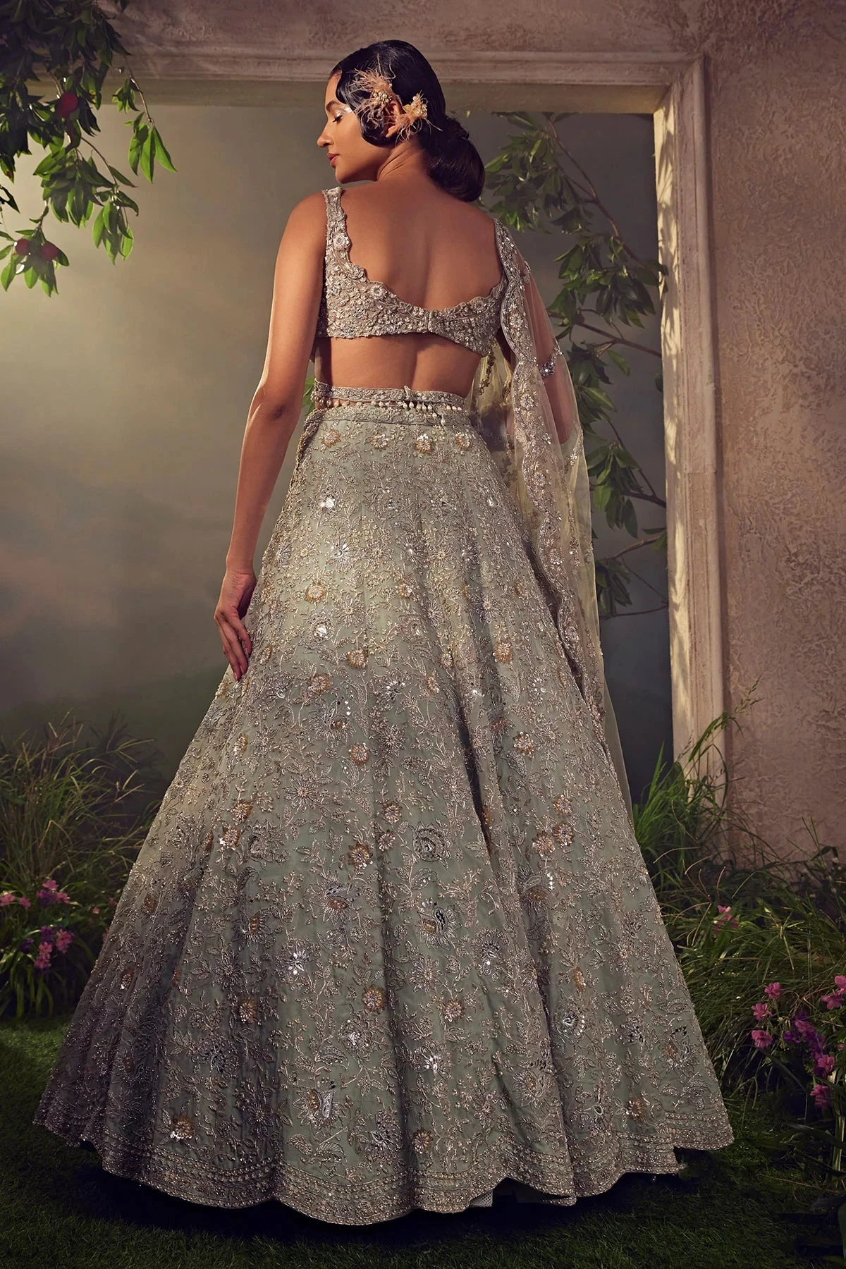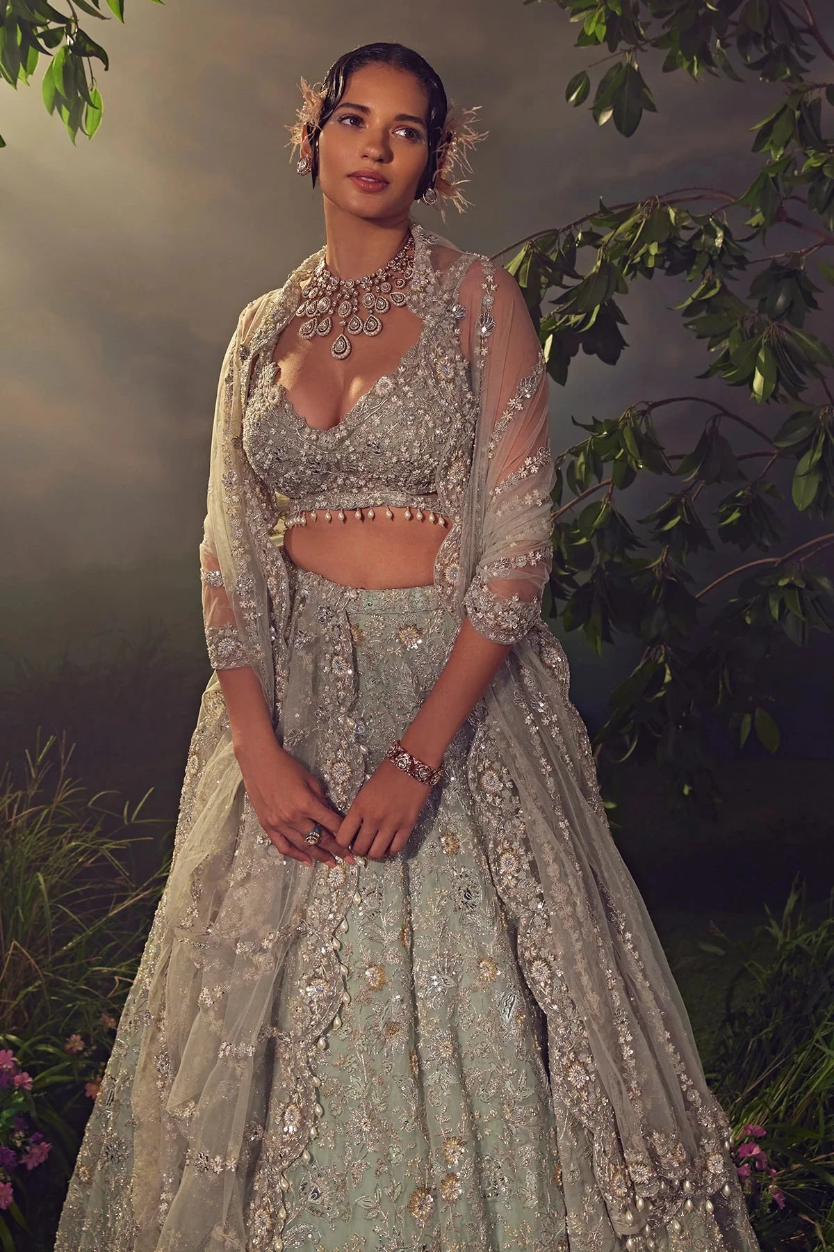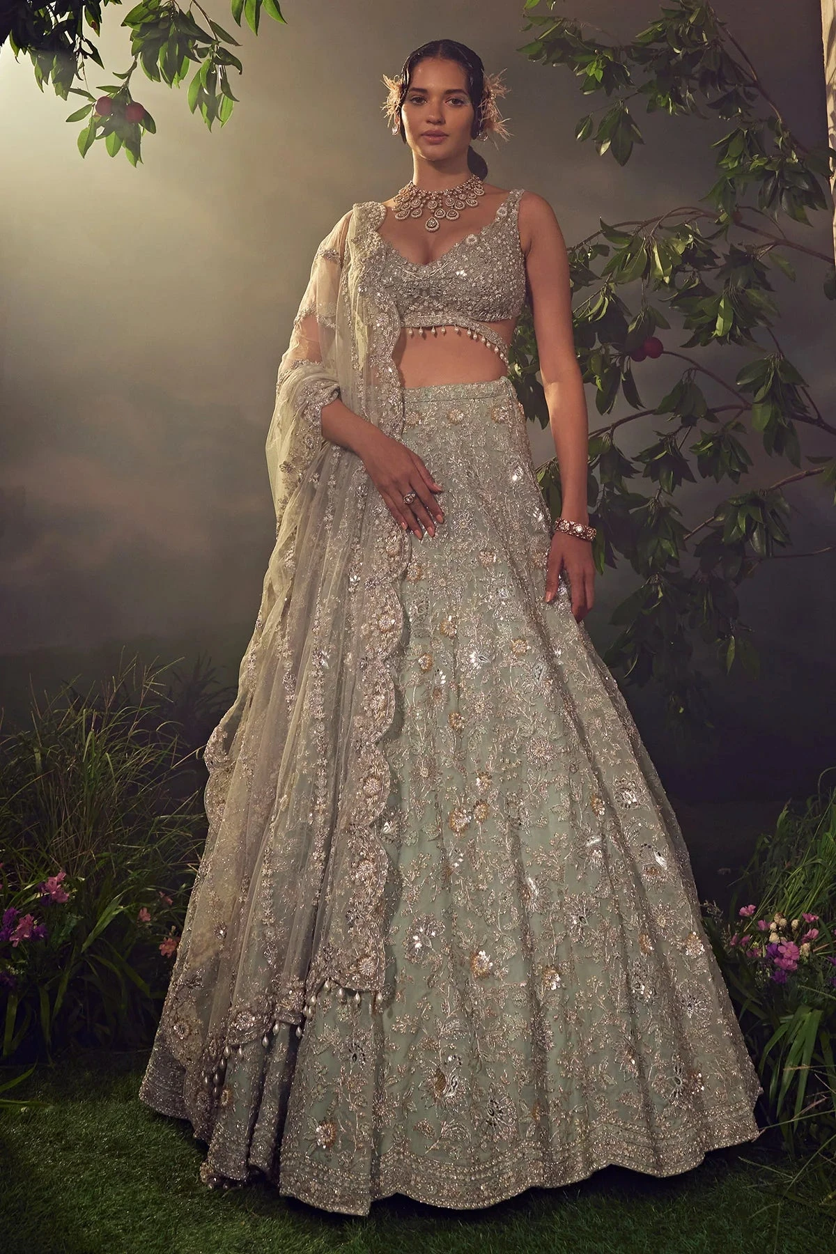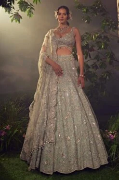 Featuring a jade green organza lehenga embellished with Japanese bugle beads, pearls, sequences and dori embroidary. Paired with a linear jaal embroidered dupatta and a stylised blouse accentuated with pearl drops