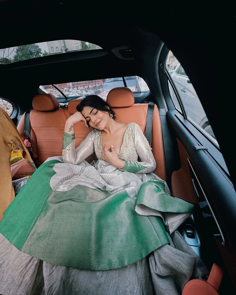 This Kalidar jacket set in pearl ivory silk zari tissue and Jacquard silk Banarasi showcases Jharokha-inspired panels with elongated paisley embroidery. The ensemble is completed with a skirt crafted from pearl gold crushed tissue, featuring delicate pearl latkan detailing at the hem.